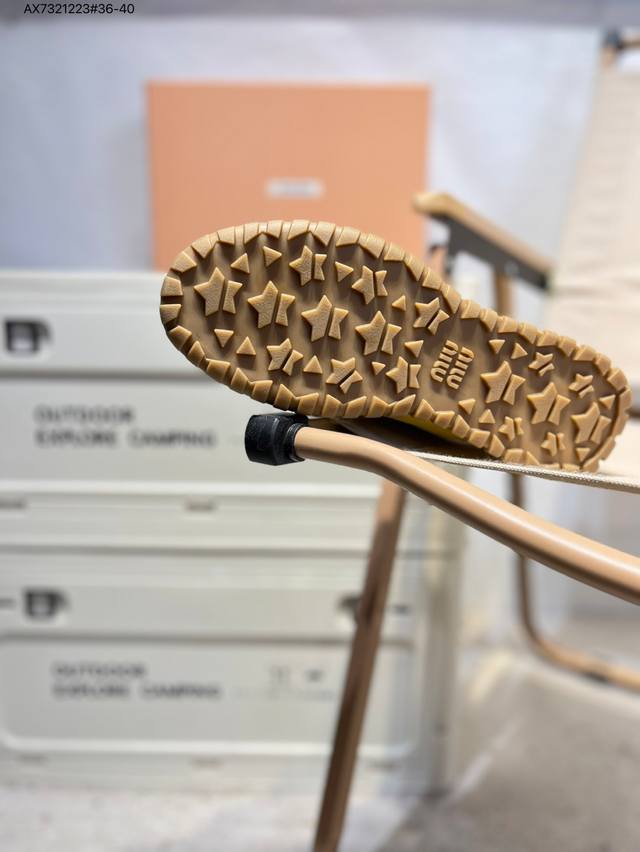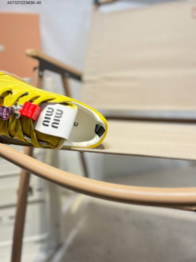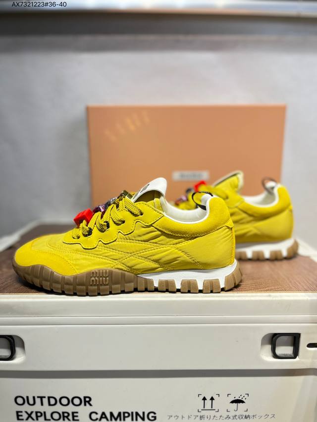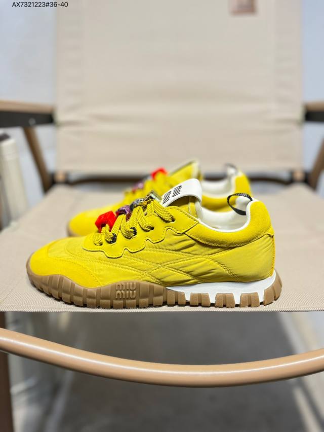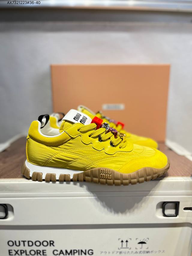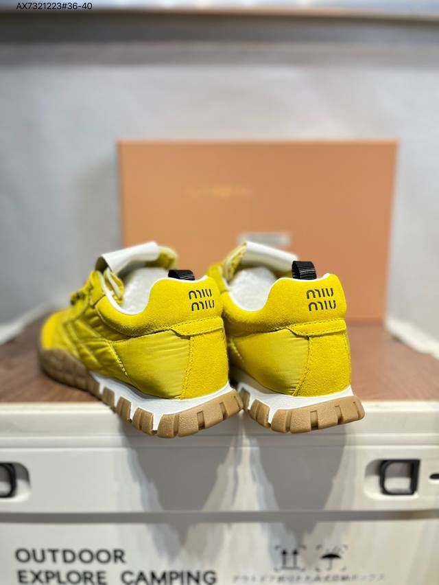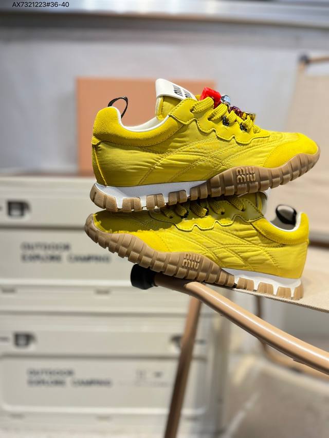 Miumiu 25Ss Tyre系列春夏最新爆款 前卫大胆的设计,风格融于简约线条,别致复古设计,平添标志性元素!这款Tyre集优雅气质与运动功能于一身,动感橡胶鞋底柔韧耐磨,令人联想起轮胎花纹,橡胶鞋底除了增加了这双鞋的复古属性外也增加了防滑功能鞋面由科技织物和麂皮制成,融合运动与时尚、功能与优雅,表达了Miu Miu的核心精神 5W792D Ax7321223#36-40