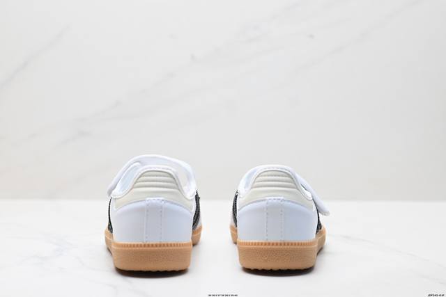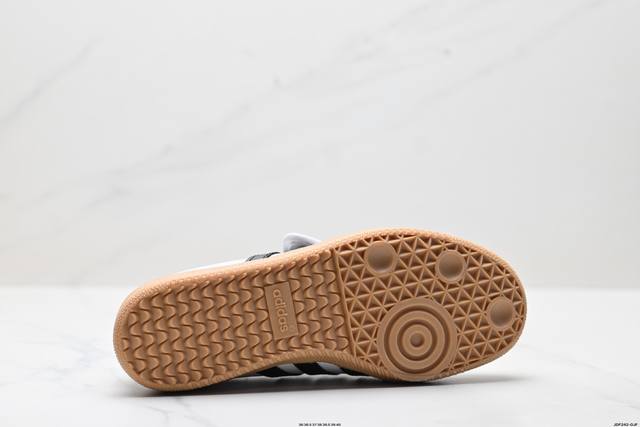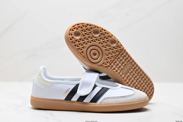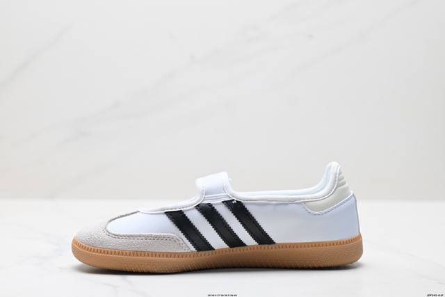Adidas Samba Janes采用皮革材质,Adidas Samba Janes的设计融合了经典与现代元素。它采用了玛丽珍鞋的特色设计,如鞋面上的扣带和环扣装饰,同时保留了Samba鞋的经典三道杠设计和橡胶大底。这款鞋的鞋型修长,中足偏窄,整体贴合感强,适合标准脚型和宽脚型的人群