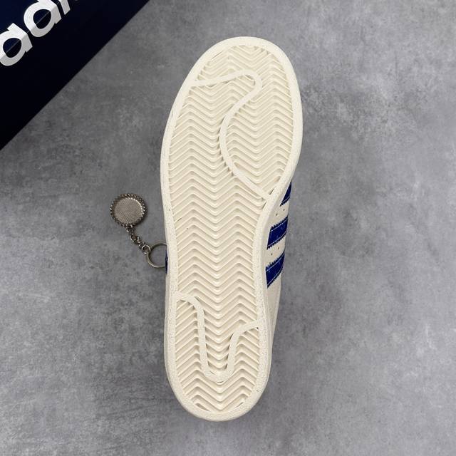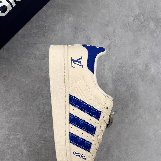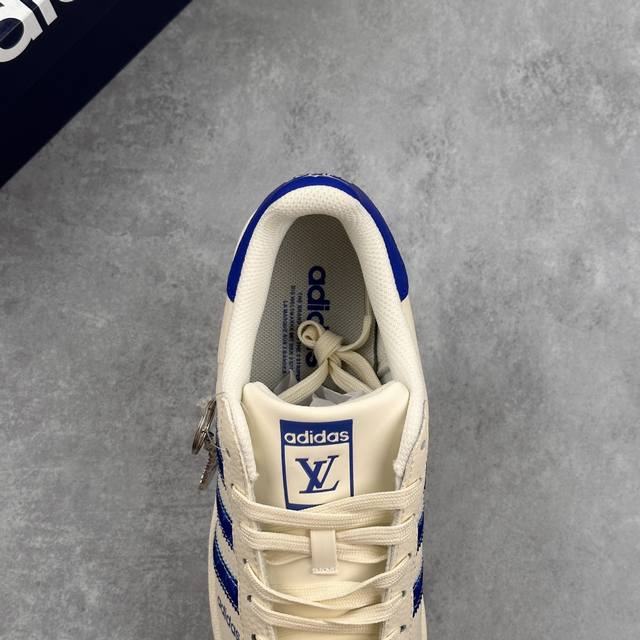 鞋身整体采用米白色皮革打造,搭配经典米白贝壳头,鞋身两侧经典锯齿三条杠Logo采用蓝色点缀,鞋舌上以蓝色Lv及Adidas字样呈现,瞬间提升鞋子的时尚程度,后跟装饰片辅以蓝色制作并带有白色Adidas字样及三叶草Llogo,后跟印有Lv字样,彰显联名身份,最后以米白色中底搭配同色橡胶外底完善整体设计收尾。