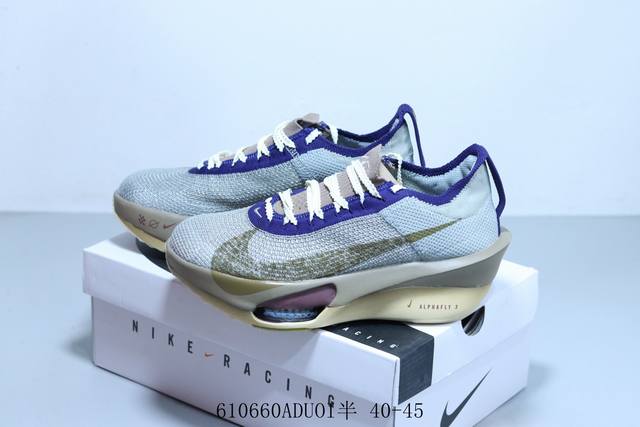 耐克 Nike Alphafly 3 “Proto” 阿尔法三代 两个Airzoom缓震配置,全掌型碳纤维板,缔造出色推进感; 中底Zoomx 泡绵从后跟延伸至