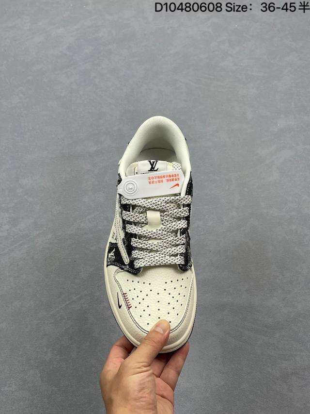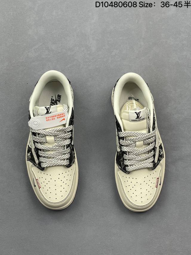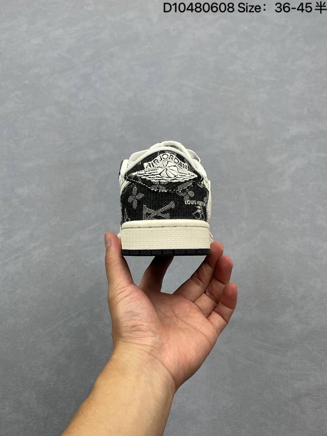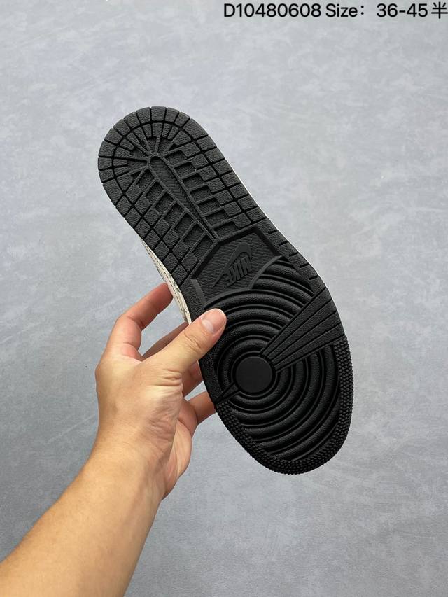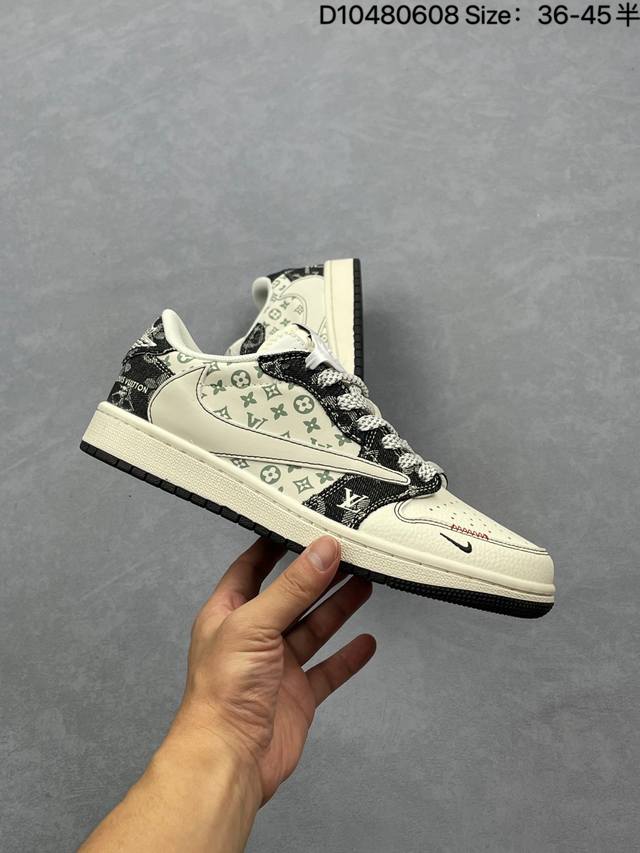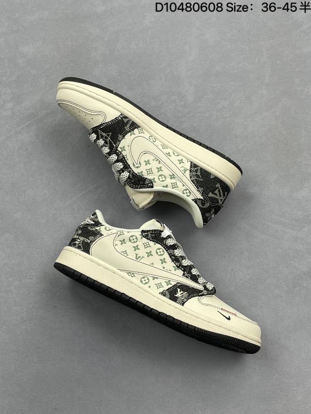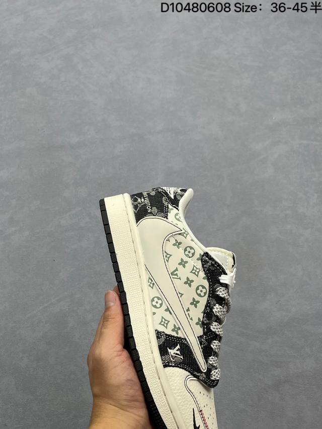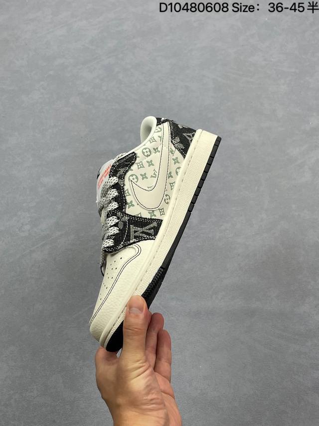 乔丹Fragment X Travis Scott X Air Jordan 1 Low 三方联名倒钩 ,整双鞋以全荔枝皮打造,腰身搭配白色 倒勾 ,再点缀上Travis Scott 标志性的Logo,后跟处以藤原浩最拿手的蓝色为主色调,完善极具Fragment Design的白蓝黑设计风格,左右脚分别以Travis Scott鬼脸和乔丹飞翼加以修饰,彰显出三方联名的奢华格调
