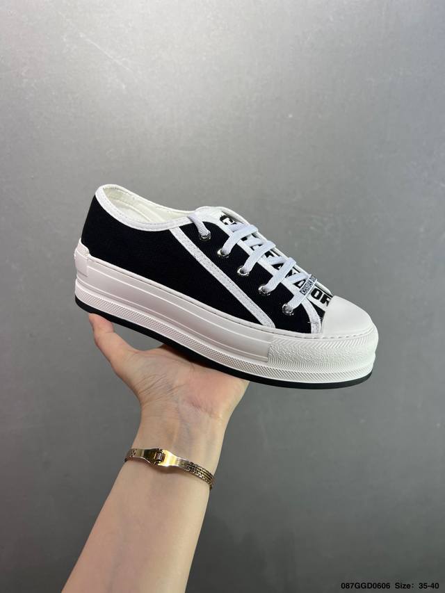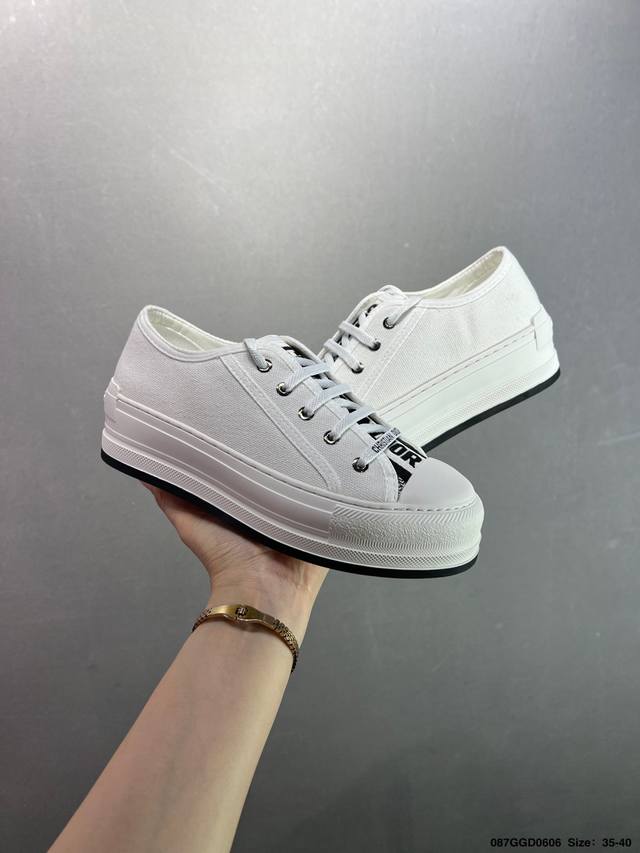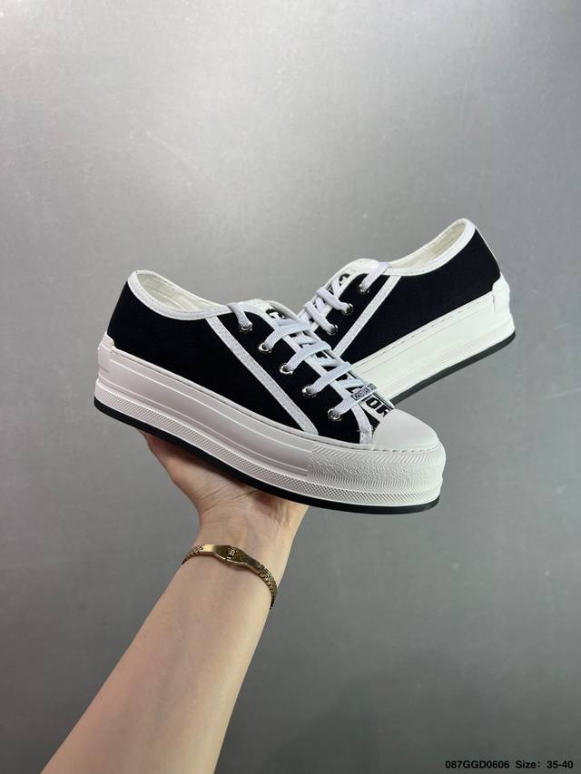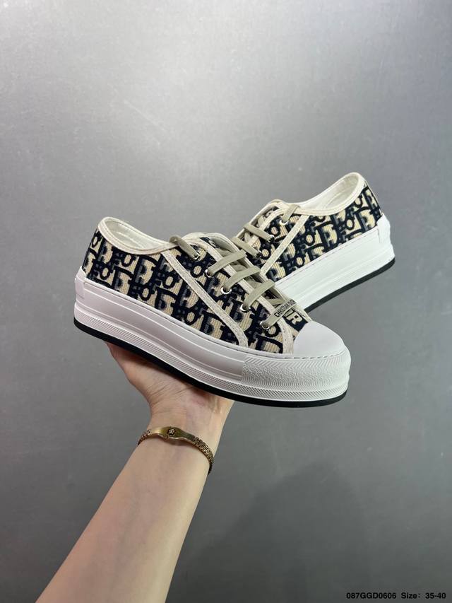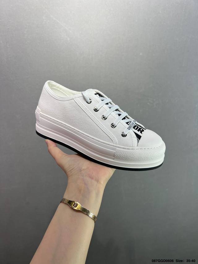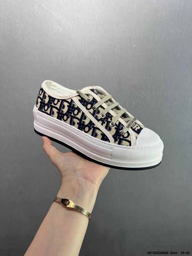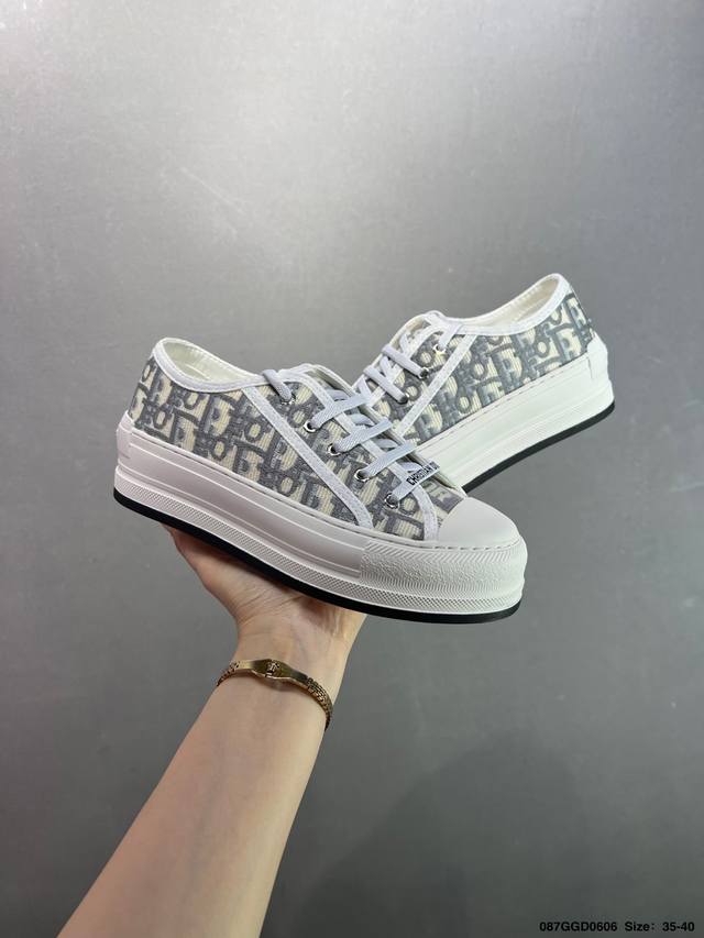 公司级女鞋广东原产#升级原楦原纸版数据开发版型#采用进口机台精密电脑提花刺绣工艺裹边处理鞋面材质#软感绵羊皮内里贴合Pu高弹发泡增高鞋垫#外置增高橡胶隔色大底 明显增高4.0Cm厘米 法国高奢时装品牌-迪奥 Dior Walk’N‘Dior Low 沃克系列低帮百搭增高休闲运动厚底板鞋“帆布岩石灰”Kck385Obe_S33G