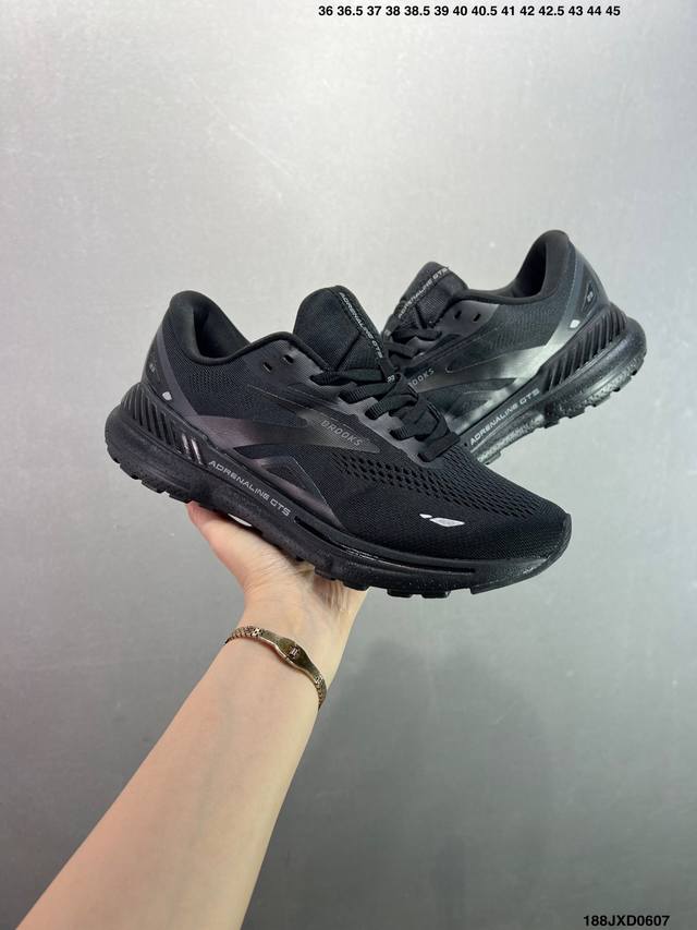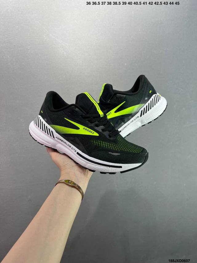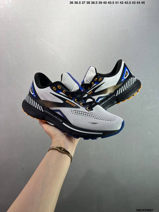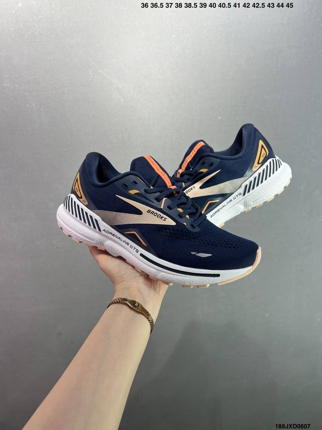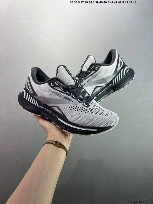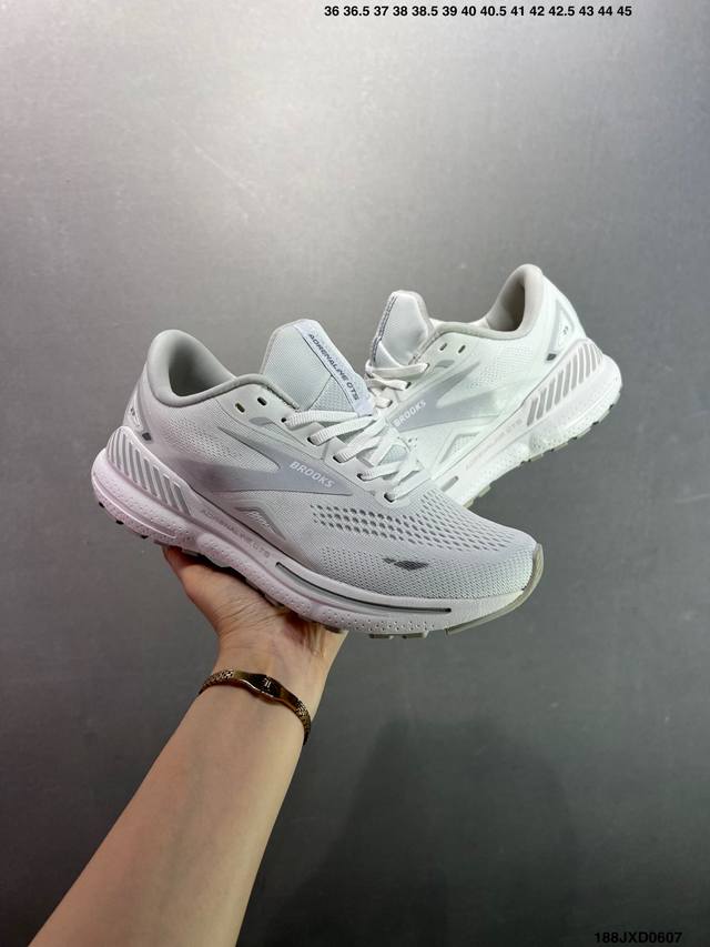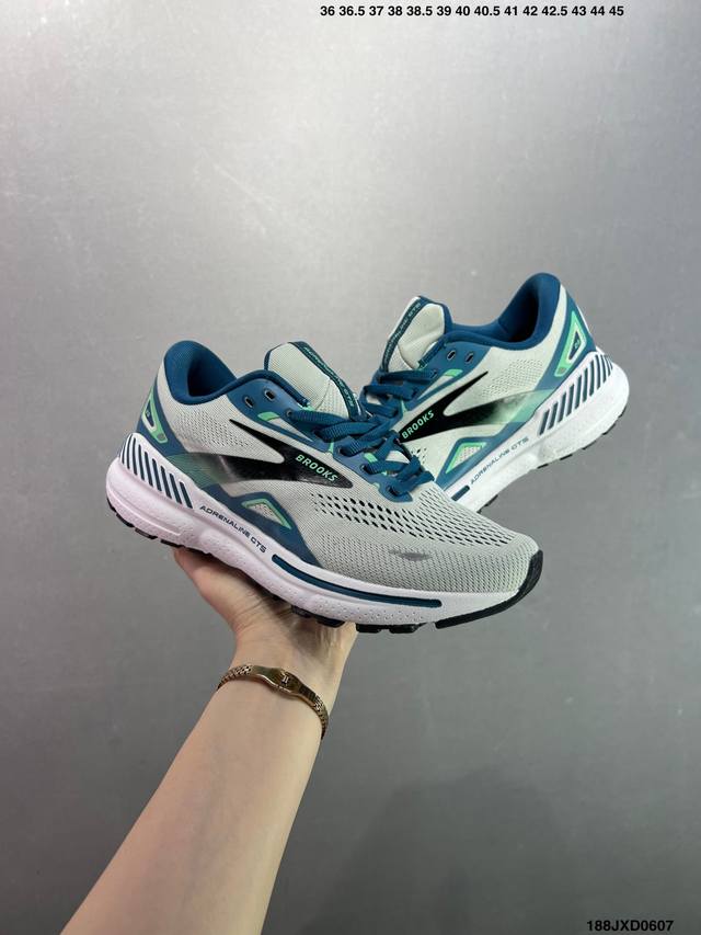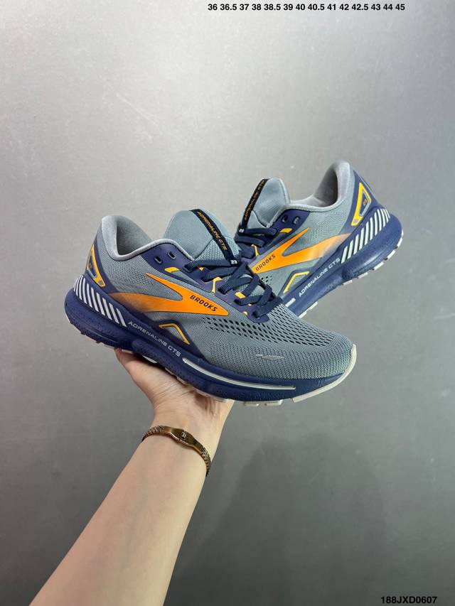 公司级Brooks布鲁克斯 Adrenaline Gts 23 舒适时尚减震透气低帮休闲跑步鞋 Brooks 四大跑鞋之一 百年品牌 跑鞋从外形上基本就能判断这是一款速度跑鞋 简洁干练的外形结构和极强的运动流线型看着非常有速度感 上脚的第一感觉是非常轻 美码9码的鞋单只206G不到 从个人偏好来说 200G左右的竞速鞋最具安全感 鞋面采用单层网布 很薄 前掌使用了大量开放式网眼 排气直接快速 透气性上乘 鞋舌也是轻量化设计 仅为一层麂皮 和脚背完美贴合 鞋舌中央有个防偏穿孔 从实际穿着来看 通常鞋舌都是外