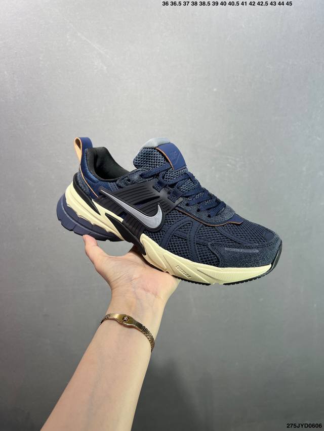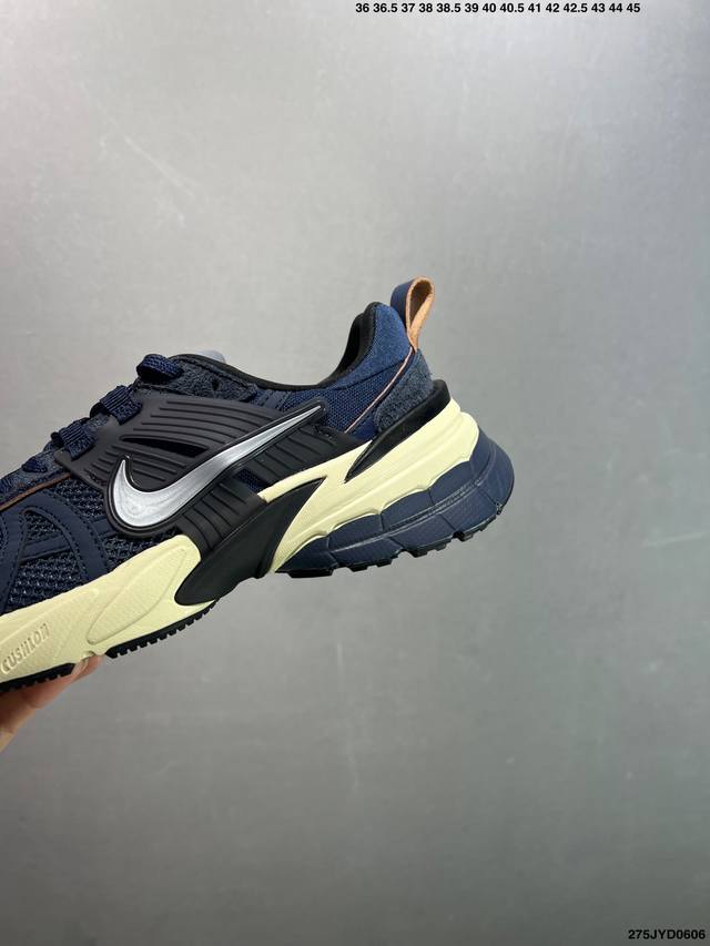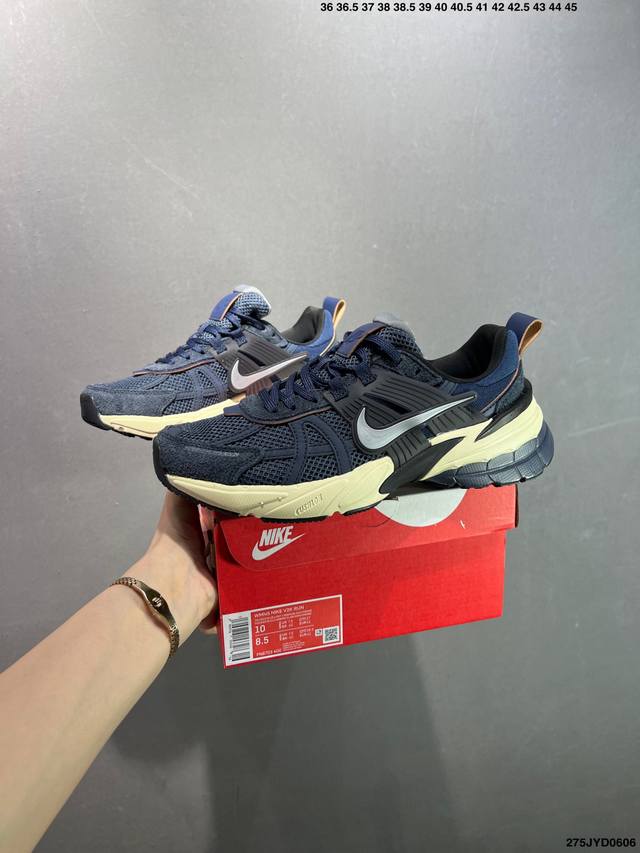 公司级Nike V2K Run跑步鞋复古风潮 网面透气运动鞋 灰银紧致的鞋面材质提供良好的包裹性鞋侧 Swoosh以及鞋头部分搭配增添不少亮点的镀铬细节鞋垫上印有Bill Bowerman头像 将细节拉满中底饰有独特的做旧效果 最后搭载黑色外底凸显整双鞋的复古气质