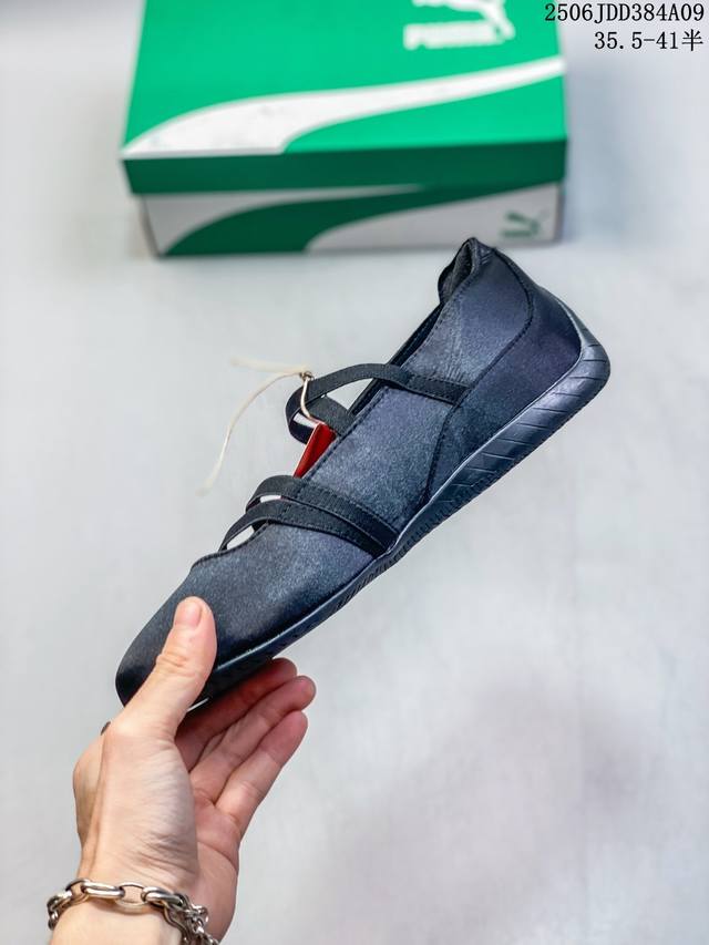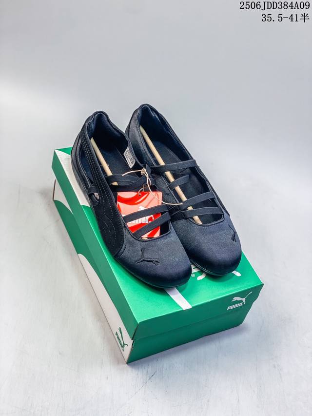 彪马 Puma Speedcat Ballet 芭蕾舞鞋玛丽珍鞋女士运动休闲鞋Puma彪马女鞋Speedcat Ls朴彩英同款赛车鞋 翻毛皮休闲鞋,Puma推出全新Speedcat Ballet鞋款,将经典玛丽珍鞋型与标志性Speedcat薄底鞋设计融合,继续引领薄底鞋风潮新篇章。Puma Speedcat Ballet鞋款以玛丽珍鞋为原型,采用开放式前脚设计,搭配弹性搭扣,流畅的轮廓灵感源自芭蕾平底鞋,优雅而不失动感。首发两款配色包括白色与银色,其中银色款更是巧妙融入F1赛车的金属色调元素,呈现出独特的