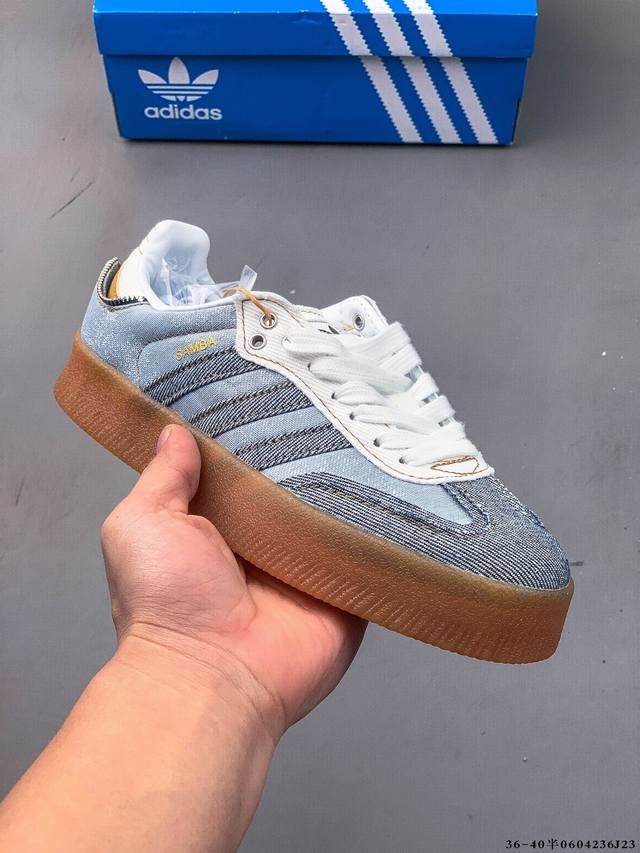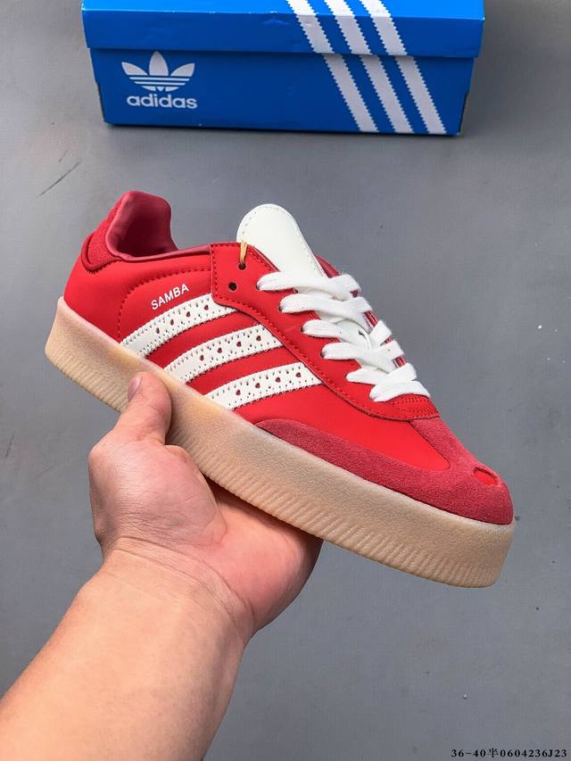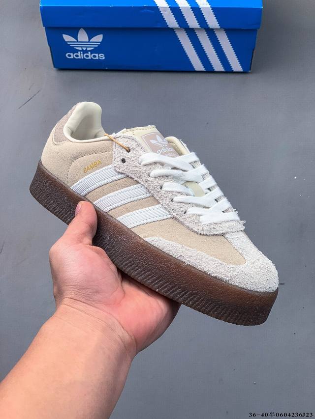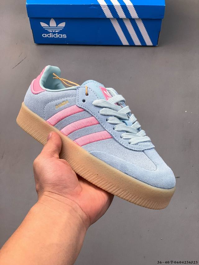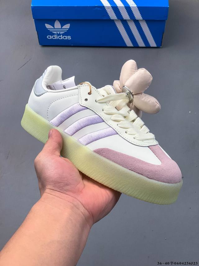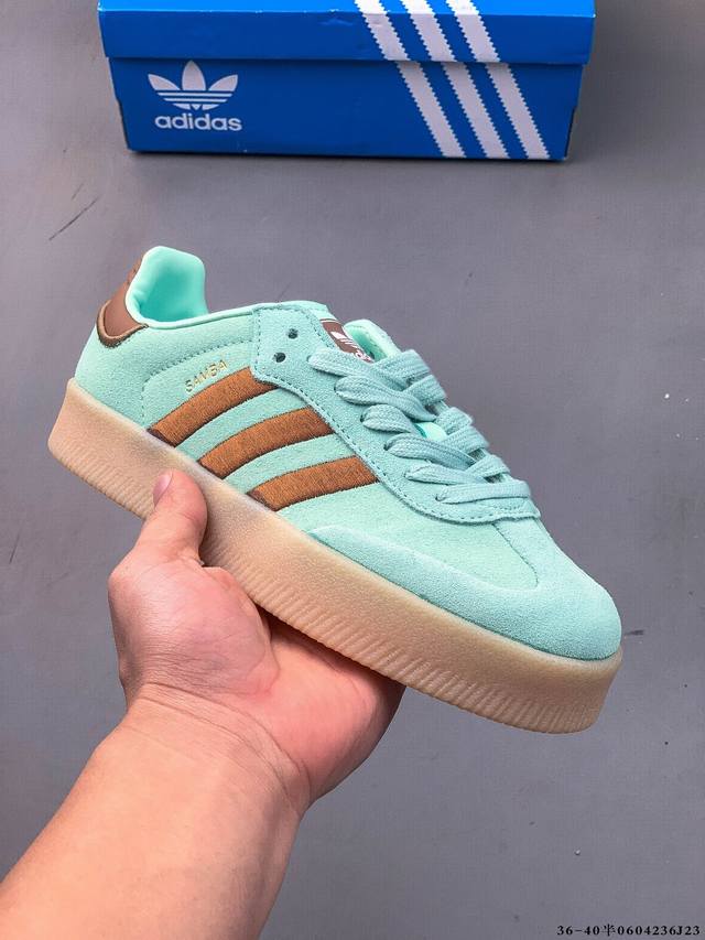 Adidas Sambae W采用了生胶材质的厚底设计,轻松提升身高同时,带来舒适体验。鞋身融入了撞色缝线及独特的鞋头造型,不仅焕新了整体的摩登风尚,更显个性与时尚感。