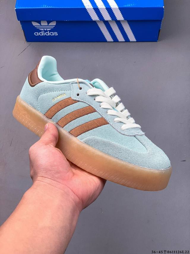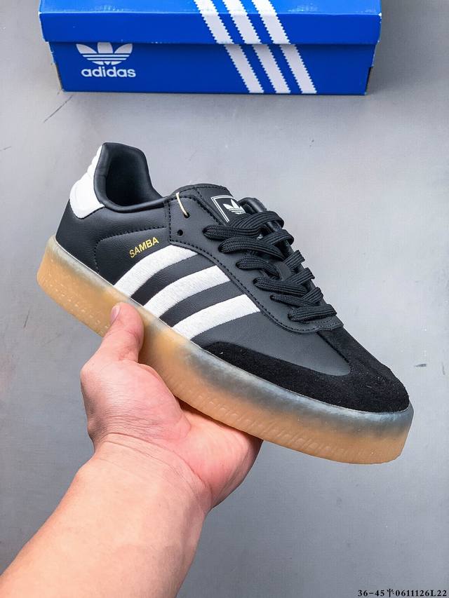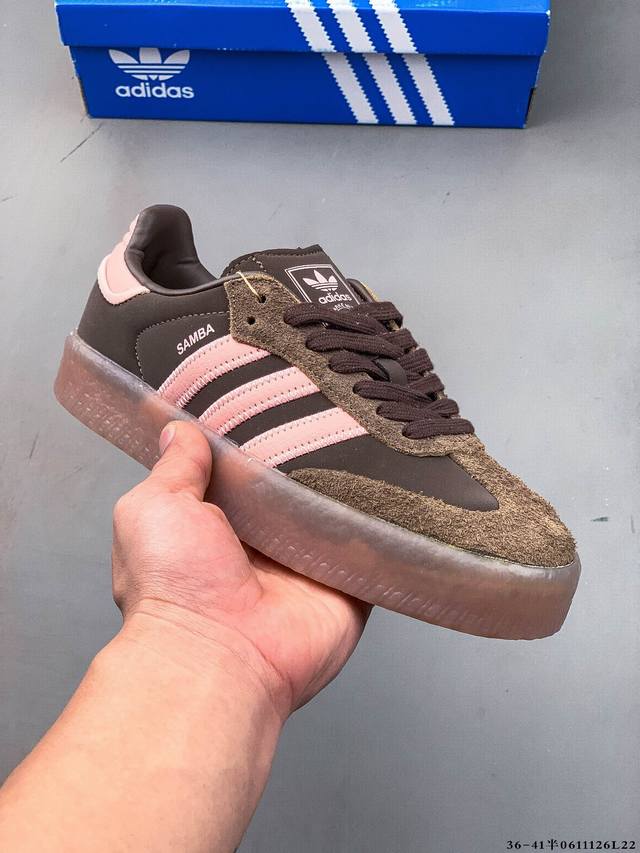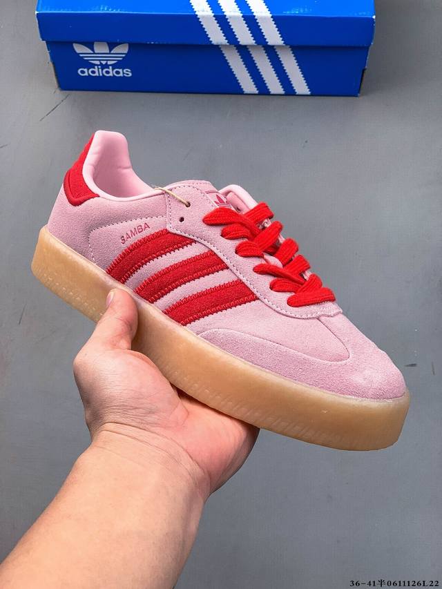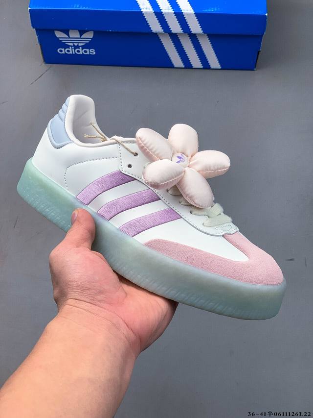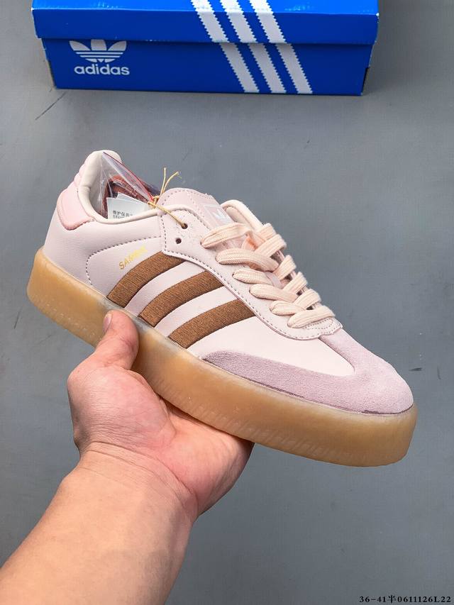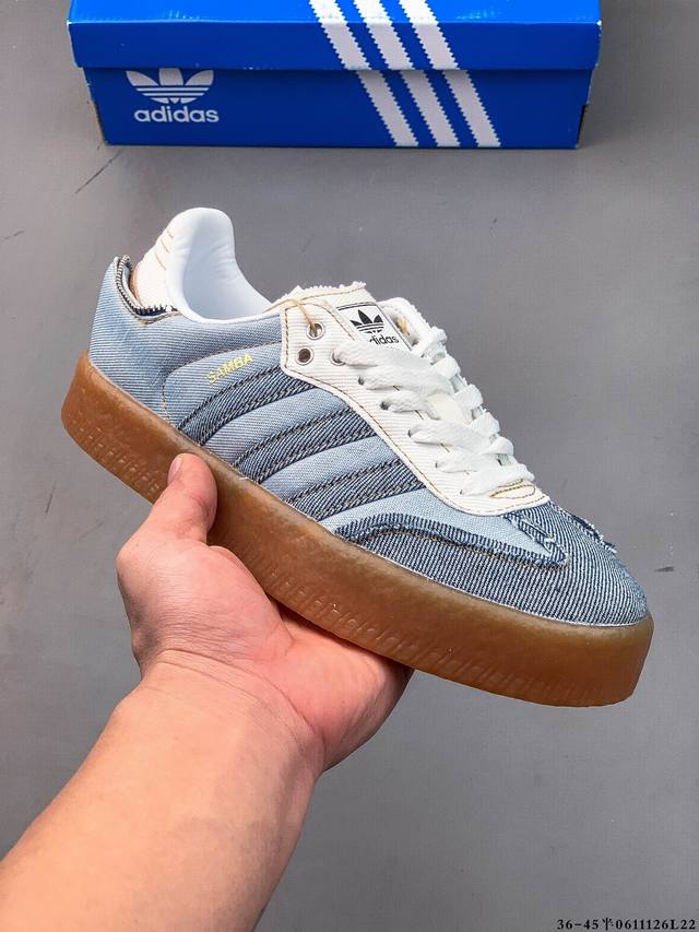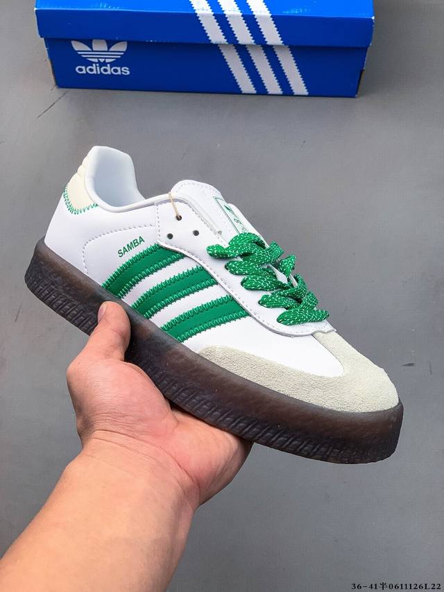 Adidas Sambae W采用了生胶材质的厚底设计,轻松提升身高同时,带来舒适体验。鞋身融入了撞色缝线及独特的鞋头造型,不仅焕新了整体的摩登风尚,更显个性与时尚感。