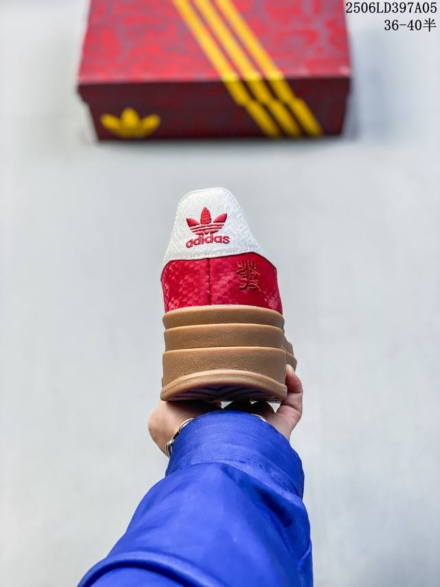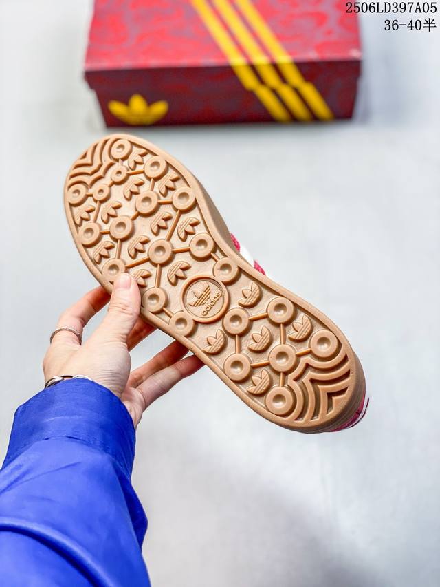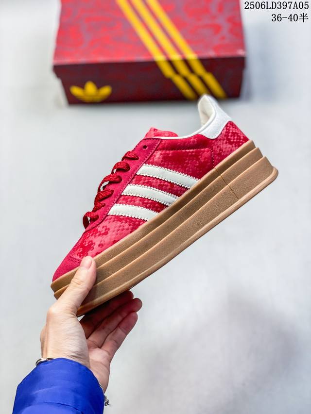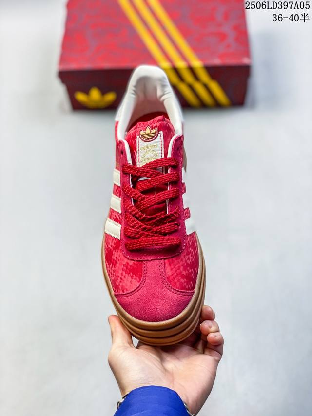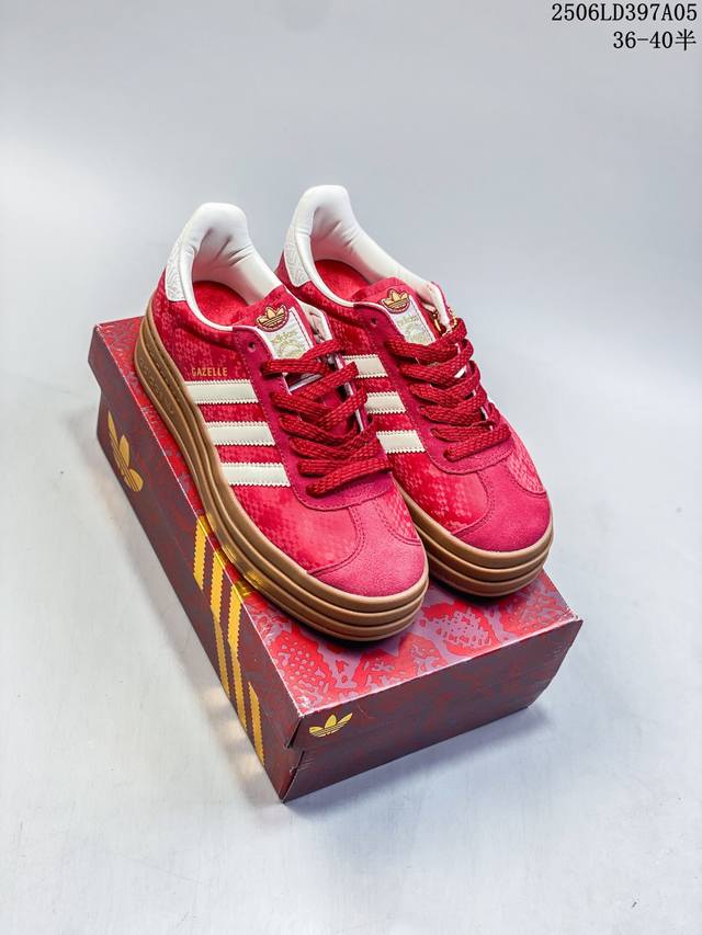 Adidas 阿迪达斯 德训系列 男女鞋真标半码制,升级原楦原纸版开发版型,采用翻毛皮组合蛇纹纤维革鞋面材质,外置加厚橡胶大底“灵蛇新生”为灵感,推出了2025蛇年限定系列!阿迪达斯 三叶草阿迪达斯Adidas Originals Gazelle Bold W Year Of The Snake 羚羊松糕系列复古百搭厚底增高低帮休闲运动板鞋“酒红米白蛇年限定 Jq5977