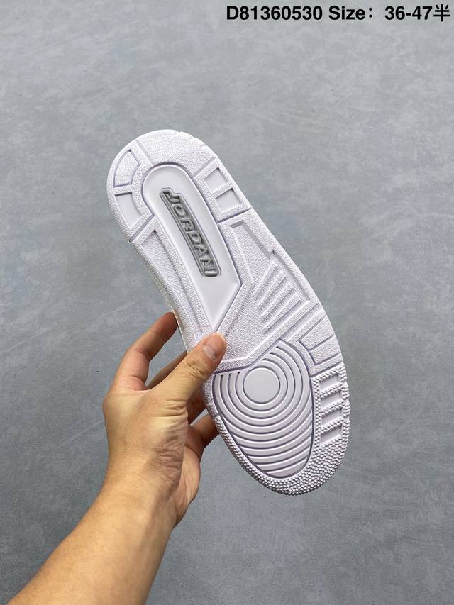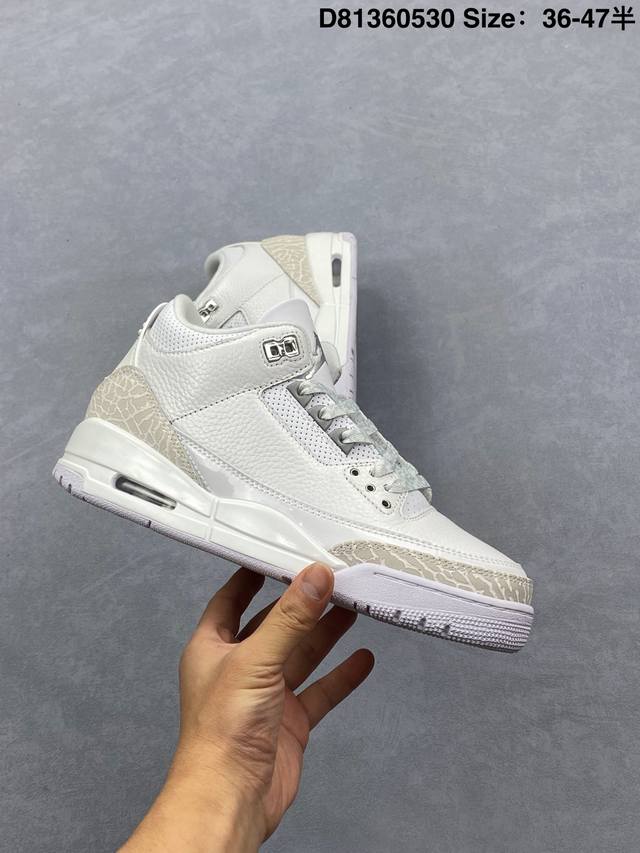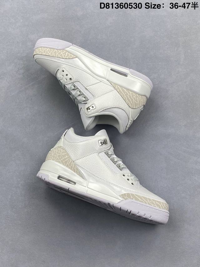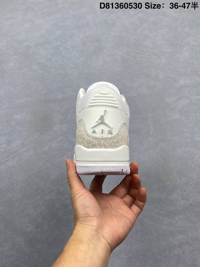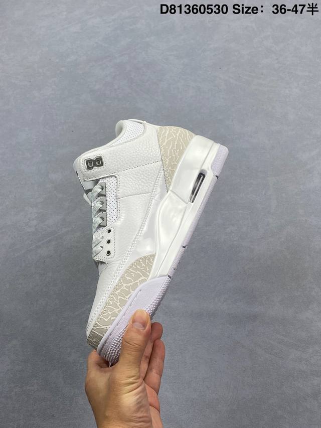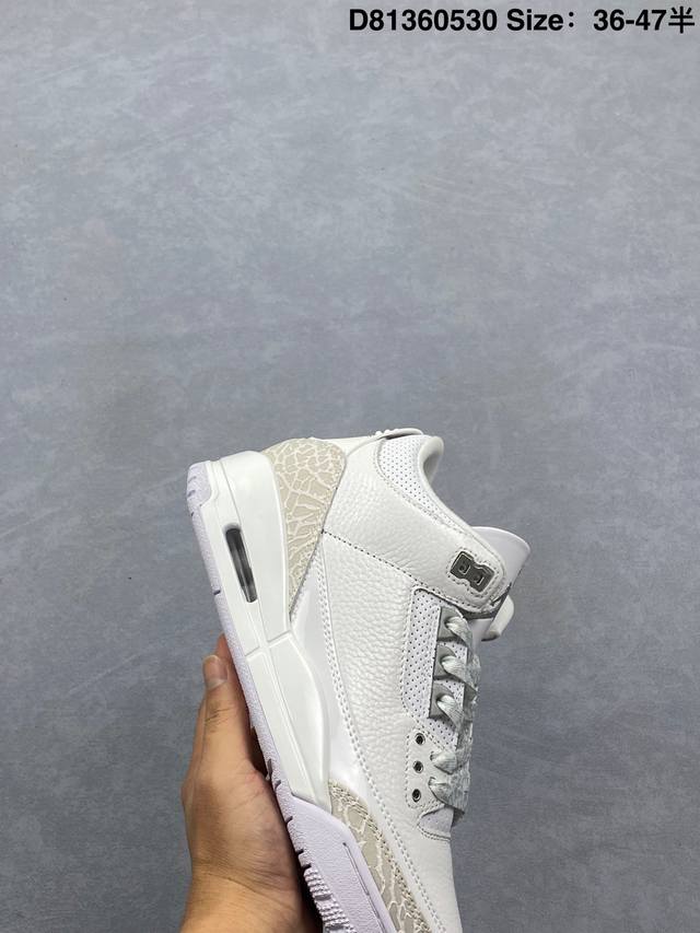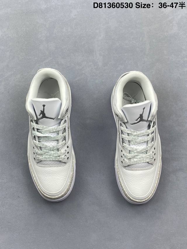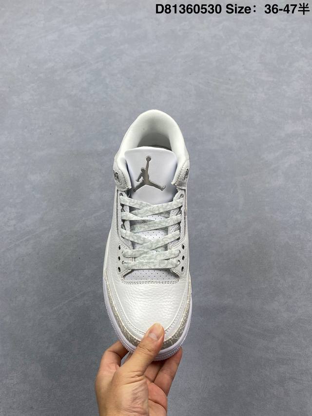 Air Jordan 3 Retro Pure Money 中帮 白猫 Aj3 乔丹3代 Aj3 中邦 白色 男女同款 乔丹篮球鞋系列 鞋身整体一袭纯白的外表不乏高贵的气质,白色的荔枝纹皮革包裹了鞋身,Aj3的象征爆裂纹以压印的方式呈现在鞋款的前后处;鞋带孔装饰以金属银材质打造,同样的材质也使用在鞋舌立体Jumpman Llogo上,翻开后跟Tpu材质将呈现 Pure 刺绣,这细节与十八年前那双完美复刻,后跟Jumpman Logo辅以银色点缀,鞋领和鞋舌的细腻孔洞皮革完美的融合了白与灰带来的视觉盛宴,最