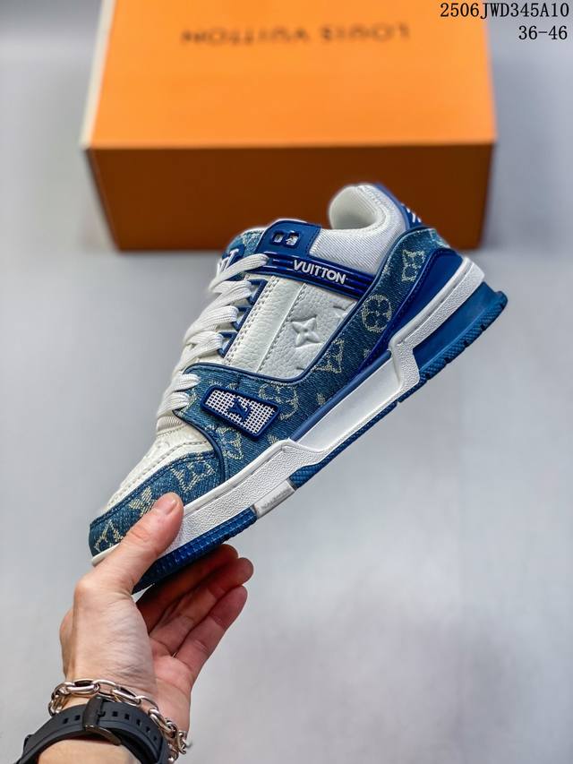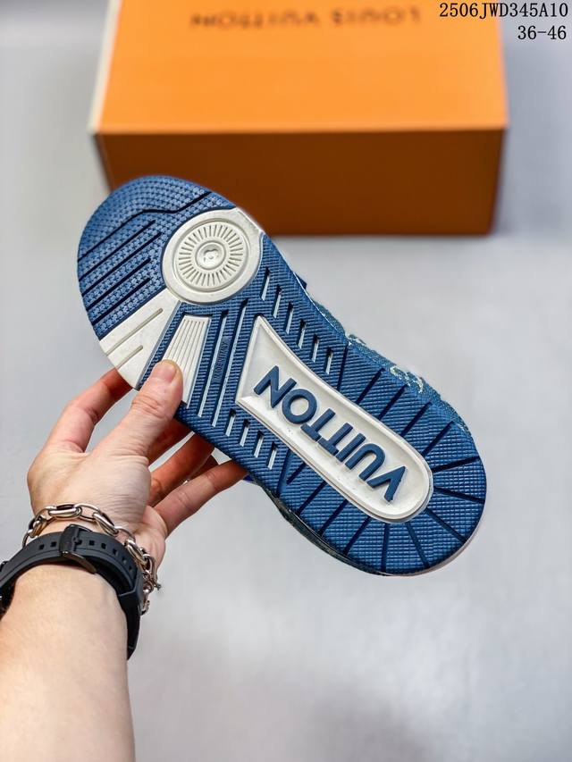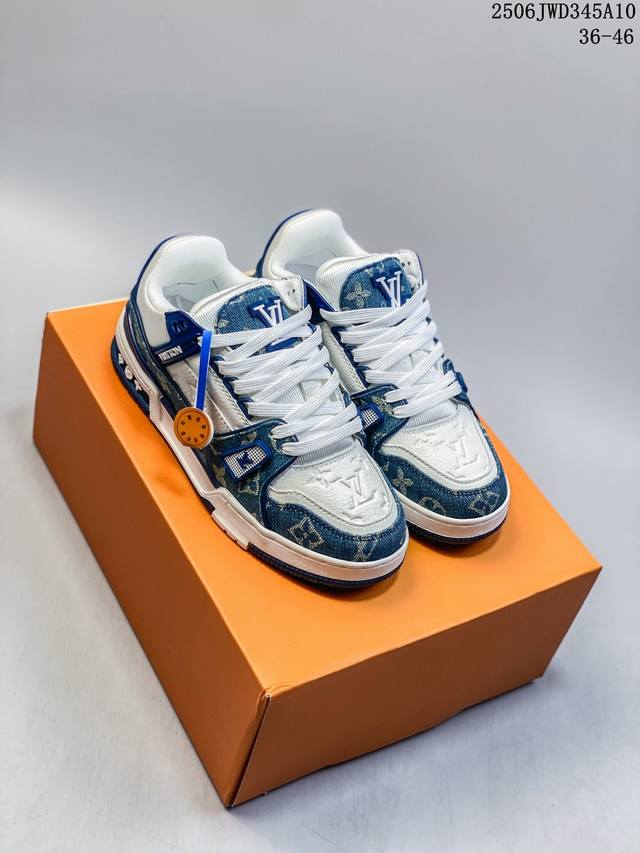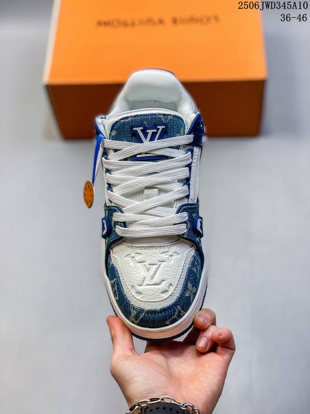 Louis Vuitton 路易威登 男女鞋配置厚实抽屉礼品鞋盒,采用荔枝纹头层牛剖革组合粒面牛剖革鞋面材质,鞋垫嵌入软脚感Eva物料,外置Tpr光泽隔色鞋底法国巴黎百年奢侈品牌Lv路易威登Louis Vuitton Trainer Sneaker Low 运动系列低帮复古百搭休闲运动文化篮球板鞋