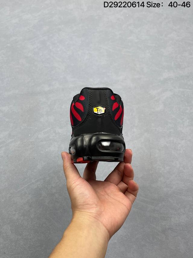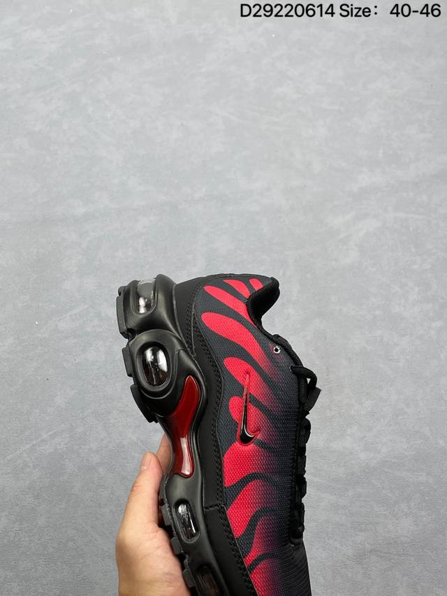 Nike 耐克 男子休闲鞋气垫缓震跑步鞋 Air Max Plus 运动鞋 造型超讨喜!鞋面以帆布和织物材质包裹,保证了轻薄透气,更适合夏季穿着。鞋侧 鱼骨 形状的 Tpu 搭配巨型 Swoosh Logo 环绕鞋面,带来极强的视觉冲击力。最后,则是以带有颗粒感的 Ceater Foam 材料的中底收尾,搭配开窗式 Air Max 气垫,保证脚感的同时完善整体造型设计。