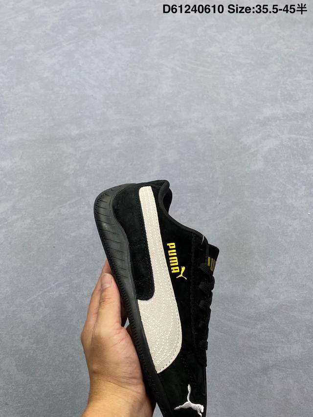 Puma Speedca Og 彪马极速赛车系列低帮德训风拼接复古百搭休闲运动赛车鞋 鞋款从80、90年代赛车手所穿的防火赛车鞋为原型,鞋身线条模仿了赛车的流线廓形,体现了空气动力学原理的结构。简约流畅的外观,恰好又和贯穿其中的Formstrip Logo融合恰到好处,视觉上细节丰富且协调。本次Speedcat Og鞋款归来,最大看点自然式保留了窄版鞋型以及薄底构造。这两年各品牌鞋底越做越厚,Speedcat反其道而行之,上脚几乎无鞋底的效果带来耳目一新的视觉体验。鞋面依旧是以质感细腻的麂皮材质打造,并且