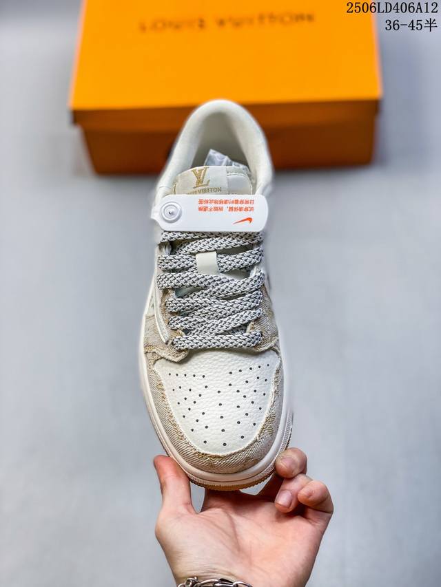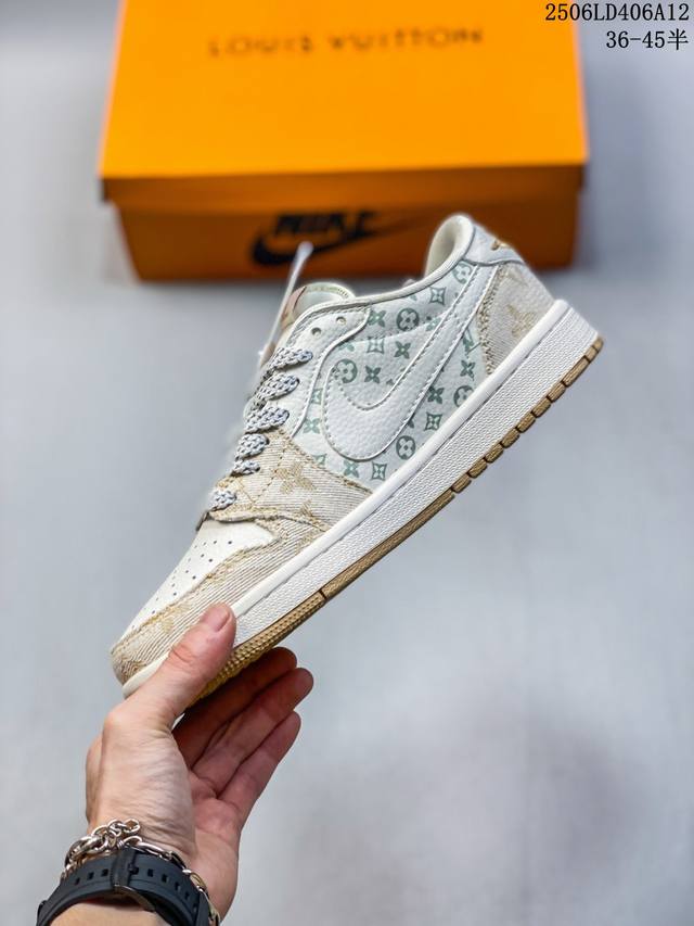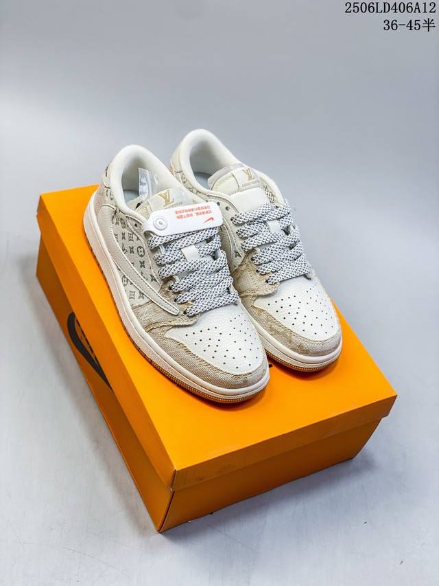 Travis Scott X Fragment Design X Jordan Air Jordan 1 Low Og Sp Lv联名 “黑牛仔印花” 多方联名合作融合了Travis Scott 独特的音乐风格,藤原浩个性的设计风格以及Jordan品牌的经典元素 使其成为一双具有独特身份和价值的鞋子 清新而立体的外观加上联名标识更突出了其独特身份 这种配色方案显示出活力和时尚感 在视觉上引人注目 鞋身的质感和细腻的细节处理使其显得高端而格调十足 这款“倒钩”联名是设计与创意完美结合 融合多方的个性风格是一
