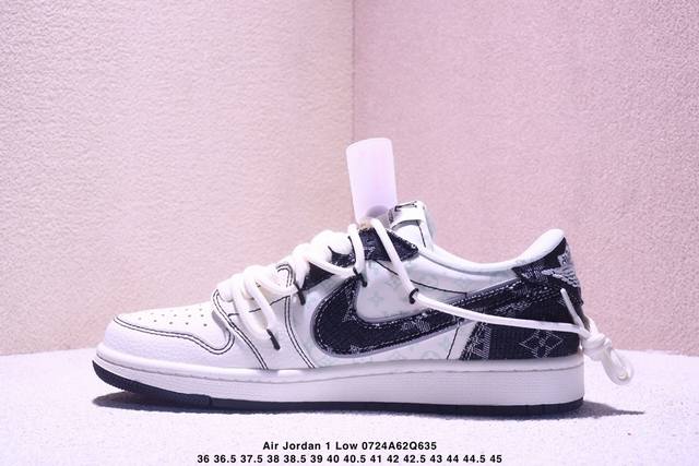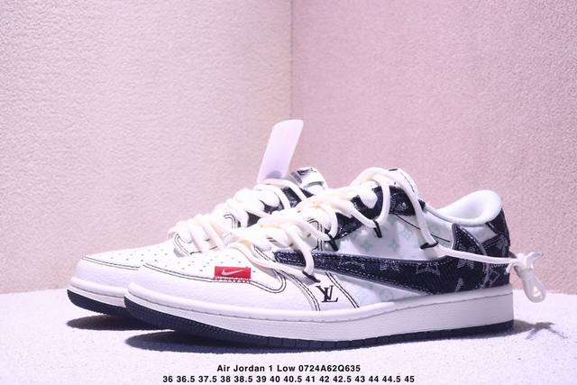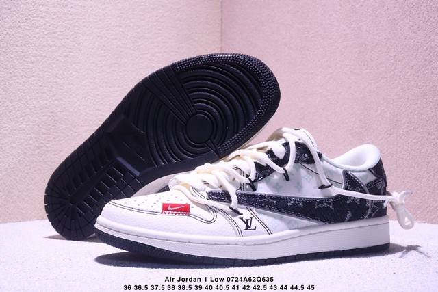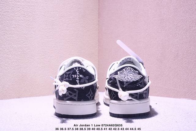 海外爆款限量发售!Travis Scott X Fragment Design X Jordan Air Jordan 1 Low Og Sp “Lv联名 黑帆布抽绳” 多方联名合作融合了Travi翻毛蓝勾S Scott 独特的音乐风格,藤原浩个性的设计风格以及Jordan品牌的经典元素 使其成为一双具有独特身份和价值的鞋子 清新而立体的外观加上联名标识更突出了其独特身份 这种配色方案显示出活力和时尚感 在视觉上引人注目 鞋身的质感和细腻的细节处理使其显得高端而格调十足 这款“倒钩”联名是设计与创意完美结