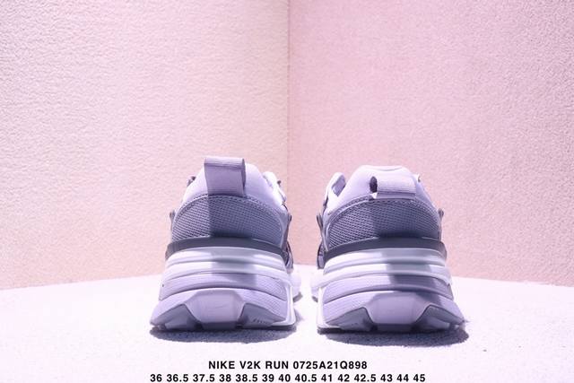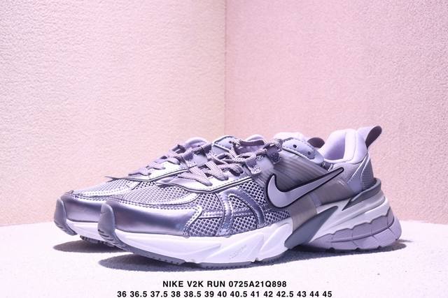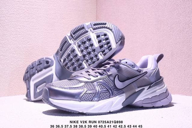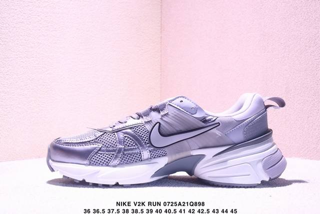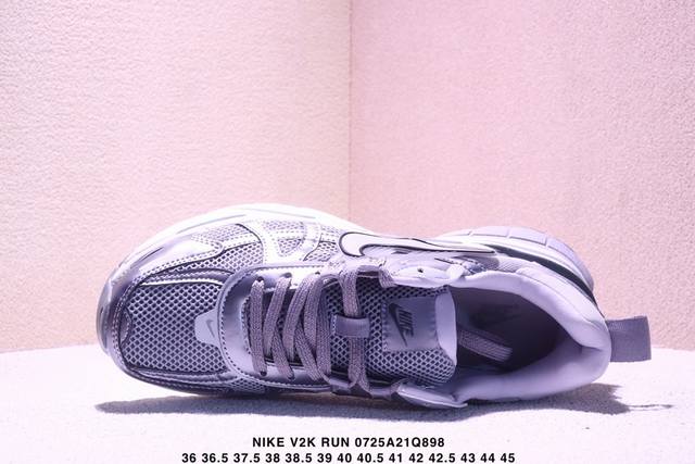 真标耐克Nike V2K Run跑步鞋复古风潮 网面透气运动鞋 灰银紧致的鞋面材质提供良好的包裹性鞋侧 Swoosh以及鞋头部分搭配增添不少亮点的镀铬细节鞋垫上印有Bill Bowerman头像 将细节拉满中底饰有独特的做旧效果 最后搭载黑色外底凸显整双鞋的复古气质 货号:Fd0736-008尺码:36 36.5 37.5 38 38.5 39 40 40.5 41 42 42.5 43 44 45Xm0725Q898