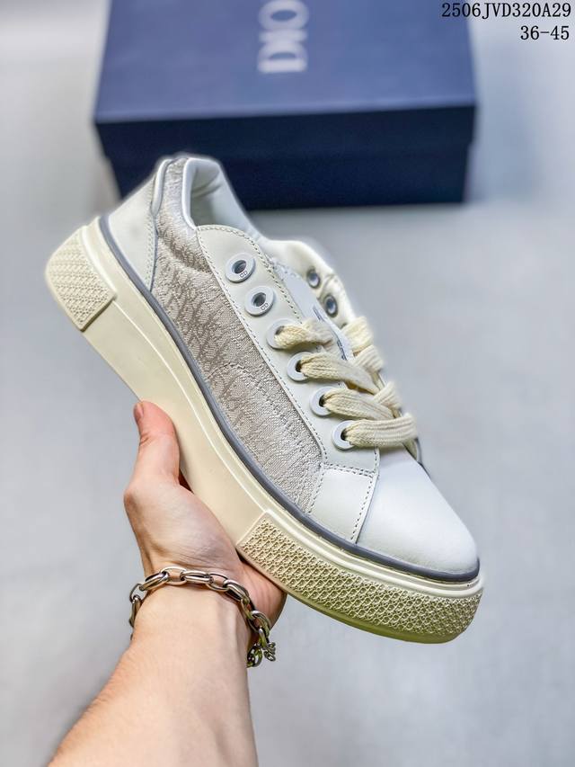 秋季新品,重新诠释经典的网球鞋,时尚的廓形突显厚实感。采用棕色和奶油白色提花面料精心制作,饰以 Oblique 印花,搭配绒面革镶片,别具一格的加垫鞋舌点缀以 Dior 压花标志,搭配蓝色马海毛宽鞋带和哑光棕色饰面黄铜孔眼。奶油白色 Dior Oblique 图案橡胶鞋底,后侧饰以对比鲜明的 Dior 30 Avenue Montaigne 标志提升格调,可为休闲造型增添时尚气质。
