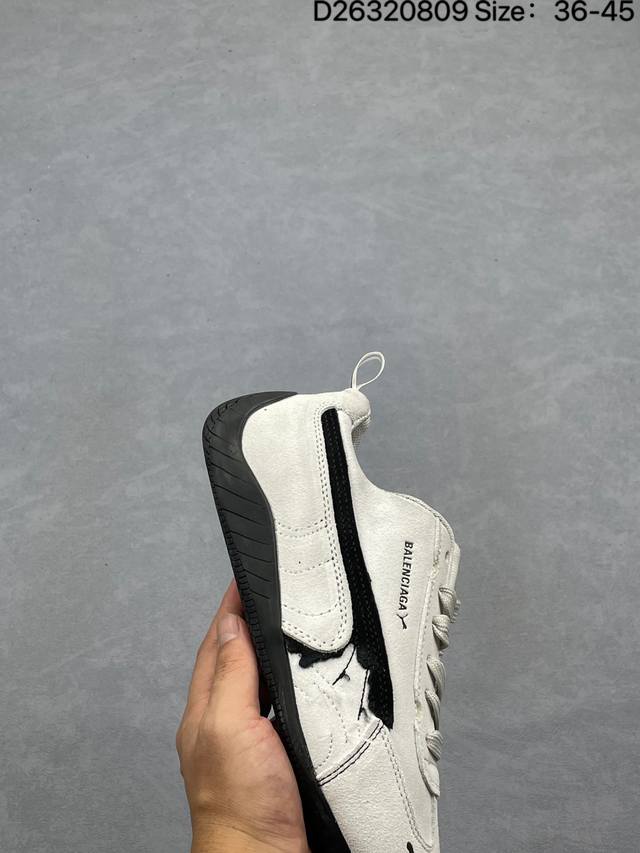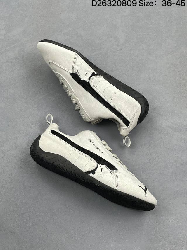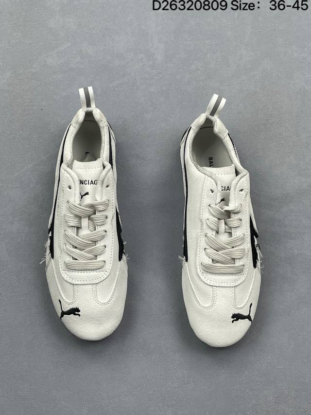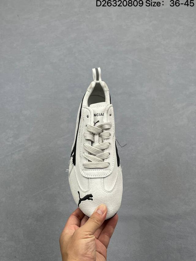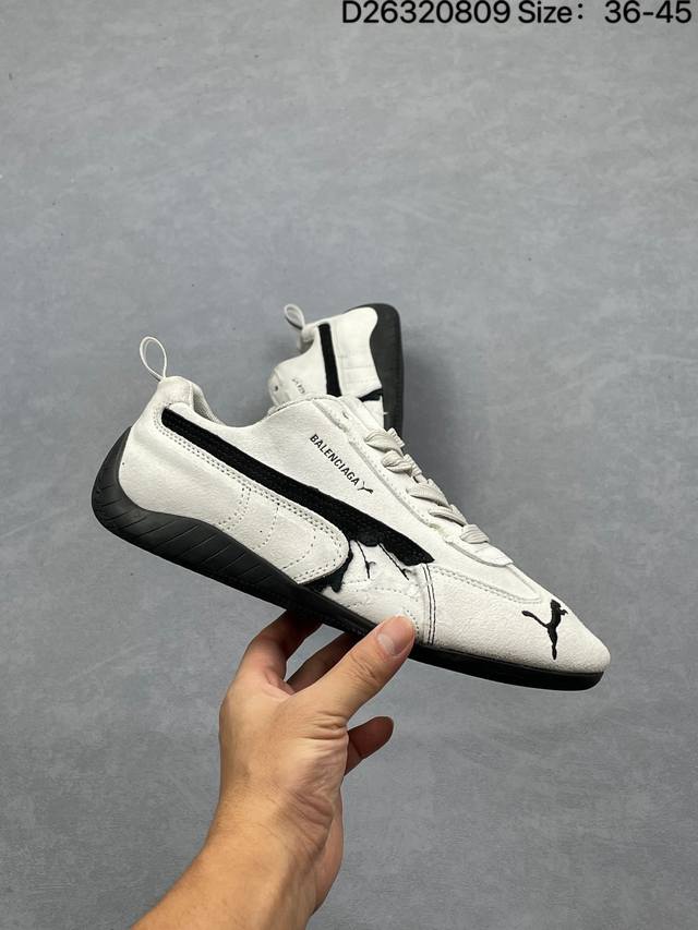 Puma X Balenciaga Speedcat系列 彪马 X 巴黎世家 低帮 联名粉色 薄底鞋牛皮圆头做旧磨损低邦生活休闲鞋 本次的Balenciaga X Puma联名选用了近两年人气极高的 薄底鞋 Speedcat为蓝本,带来了多个不同配色的联名鞋款;Balenciaga X Puma Speedcat在色调上继承了这双赛车鞋原本的惯用方案,但鞋身侧面标志性的Puma Formstrip标志则采用了 破