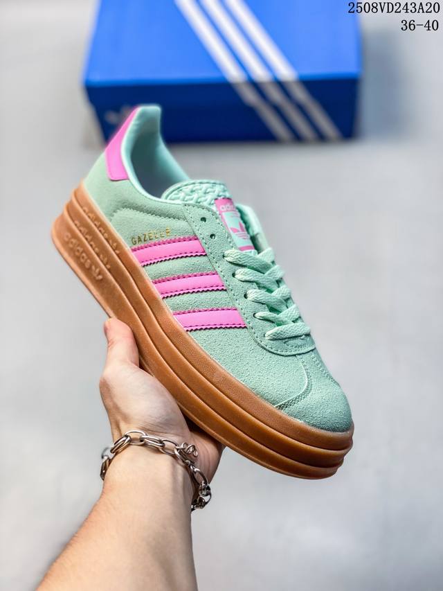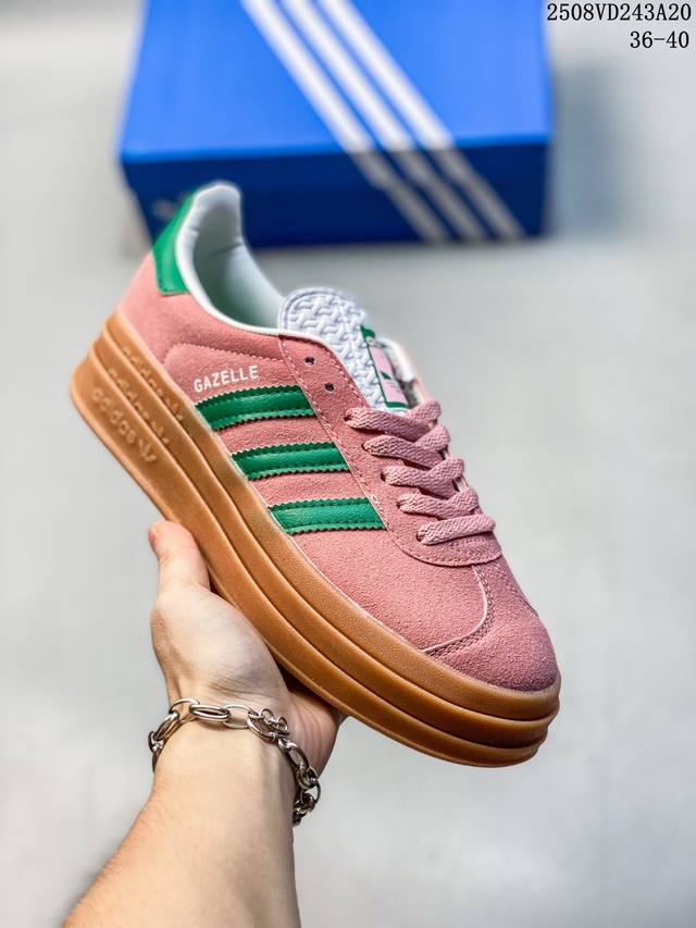 女鞋#升级原楦原纸版开发版型#采用翻毛皮组合纤维革鞋面材质#外置加厚橡胶大底三层松糕 女生绝对爱! Originals Gazelle Bold W 羚羊松糕系列复古百搭厚底增高低帮休闲运动板鞋“翻毛淡粉红绿生胶底”