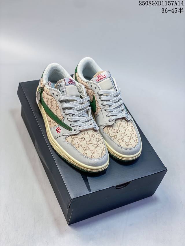海外爆款限量发售!Travis Scott X Fragment Design X Jordan Air Jordan 1 Low Og Sp “古驰联名 花纹绿棕” 多方联名合作融合了Travi翻毛蓝勾S Scott 独特的音乐风格,藤原浩个性的设计风格以及Jordan品牌的经典元素 使其成为一双具有独特身份和价值的鞋子 清新而立体的外观加上联名标识更突出了其独特身份 这种配色方案显示出活力和时尚感 在视觉上引人注目 鞋身的质感和细腻的细节处理使其显得高端而格调十足 这款“倒钩”联名是设计与创意完美结合