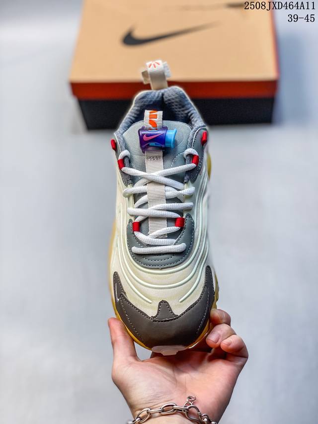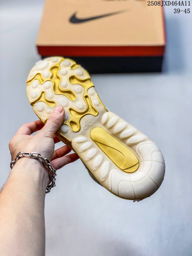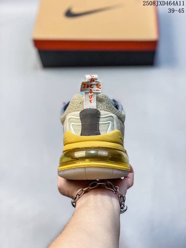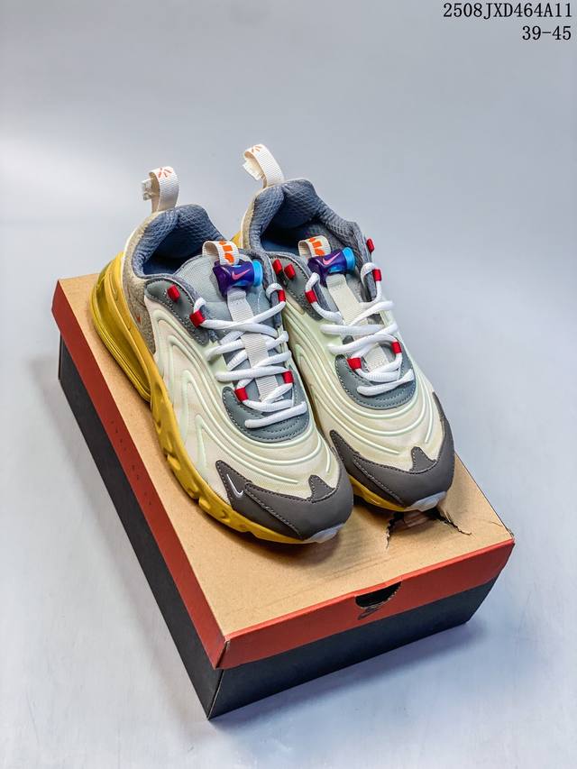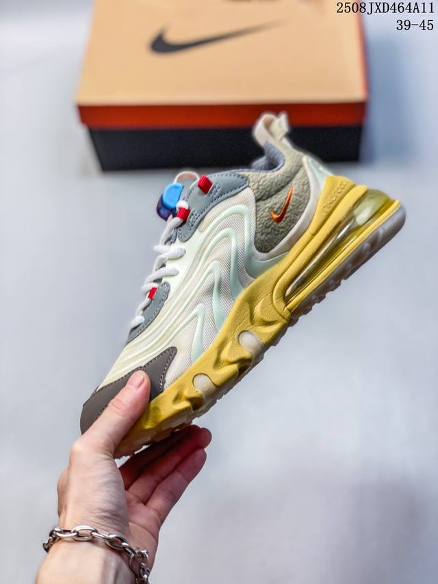 真标耐克Travis Scott X Nike React Air Max 270 React Cactus Jack 米黄 高桥盾系列 联名机能半气垫跑步鞋 。具备时尚风格和舒适感受,演绎未来风范。柔软泡棉中底搭载大体积 Max Air 气垫,造就传统运动鞋可望而不可及的缓震配置。舒适弹性内衬带来如袜子般的贴合感,在你大显身手时带来稳固锁定的出众脚感。