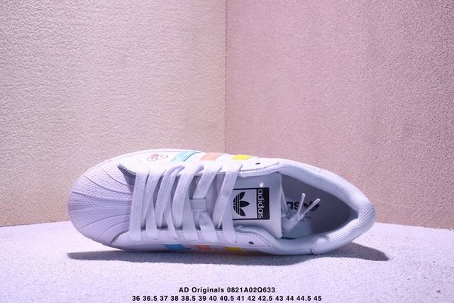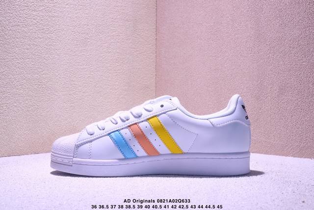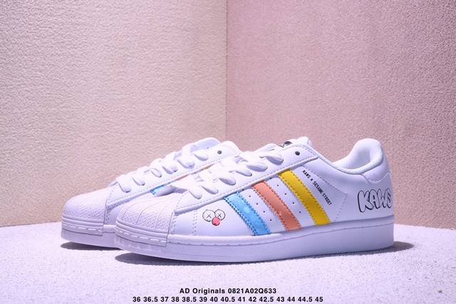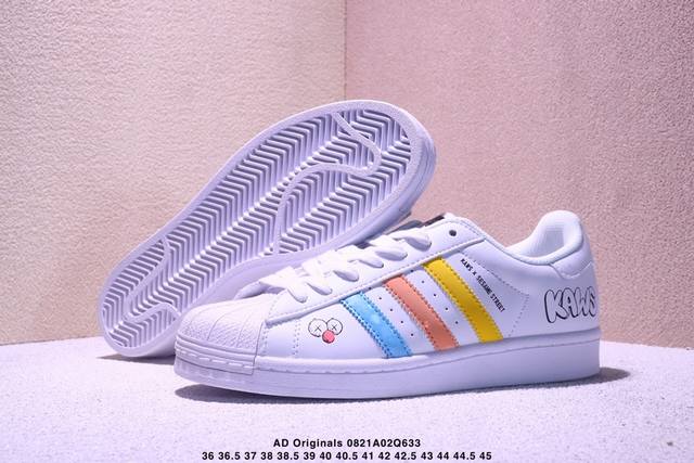 纯原 Clot X Ad Originals #贝壳头Kaws联名限定 贴合柔软皮料黄橙蓝三道杠配色 ,这双鞋的整体设计思路和风格可以说很Clot。鞋款整体选用了易穿搭的白色作为主色调,而加厚的锯齿形外底以及标志性的贝壳头无疑把鞋款的独特属性进一步展现出来。