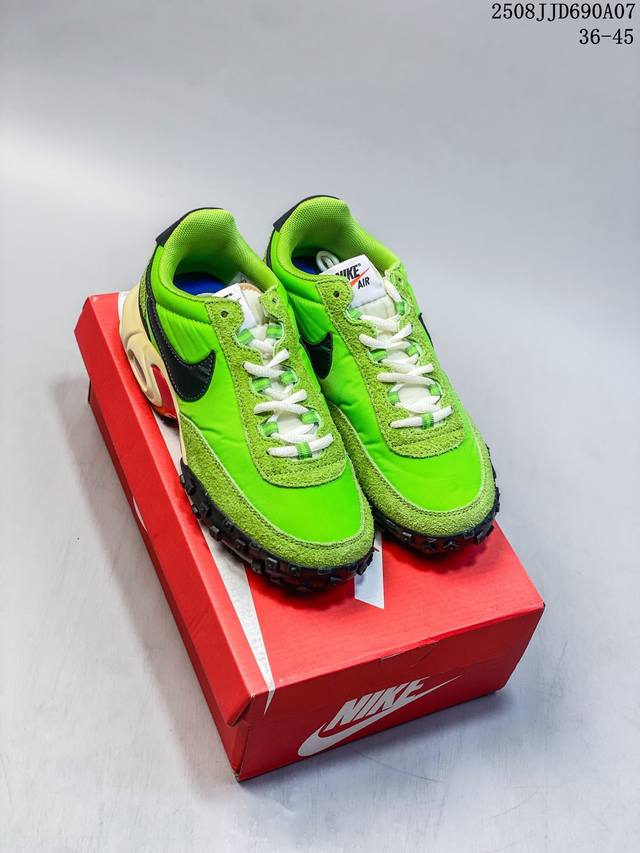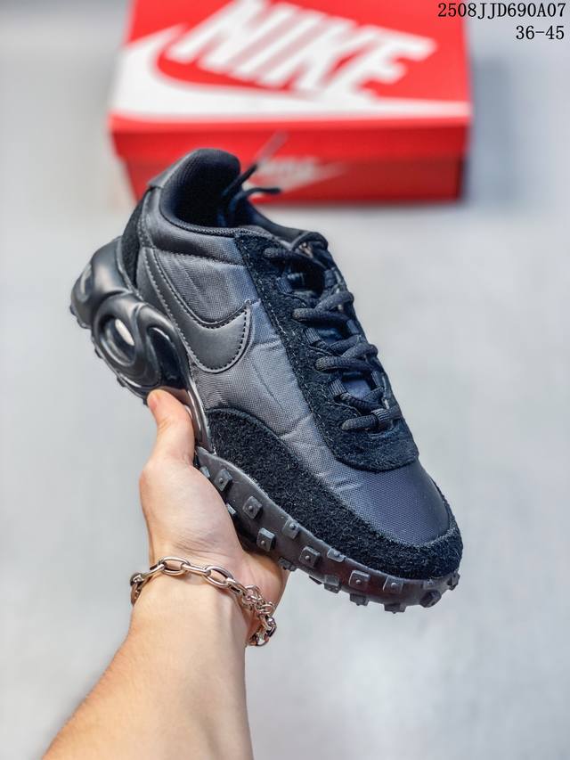 此款 Air Max Waffle’Black And Anthracite‘根植经典,匠心糅合 Nike 两大革命性鞋款,打造前卫的创新设计。该鞋款沿袭 Air Maxplus 的经典中底和Tuned Air 缓震配置;轻盈鞋面及华夫格外底则来自 70年代风靡一时的 Waffletrainer 鞋款。同时,鞋面以煤黑色光泽感织物搭配翻毛皮覆面,呈现复古且有新意的