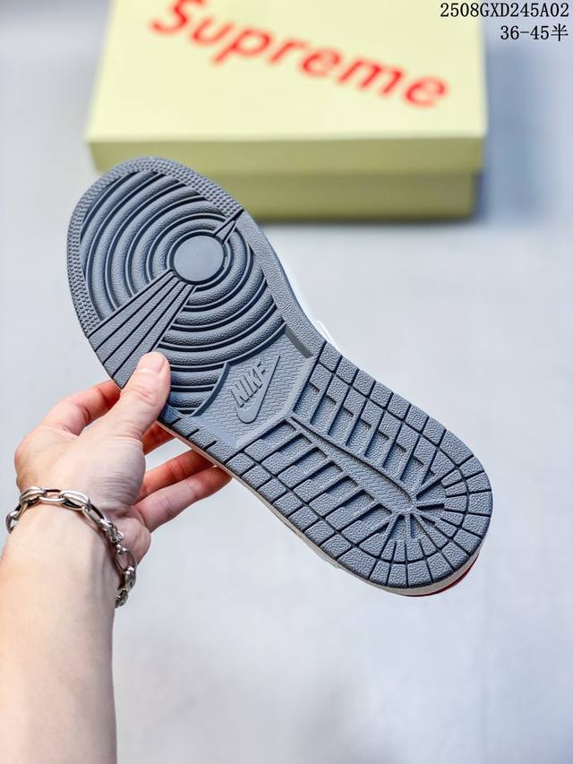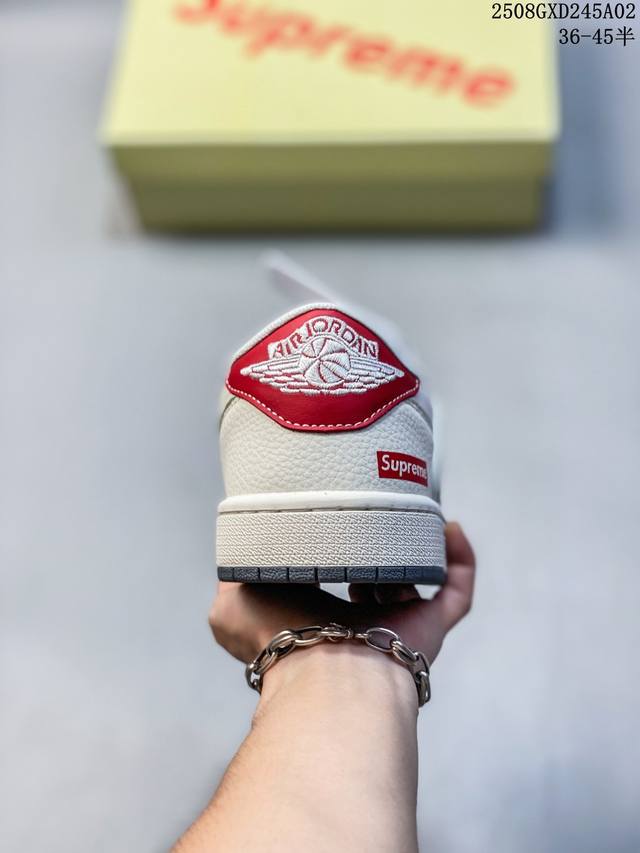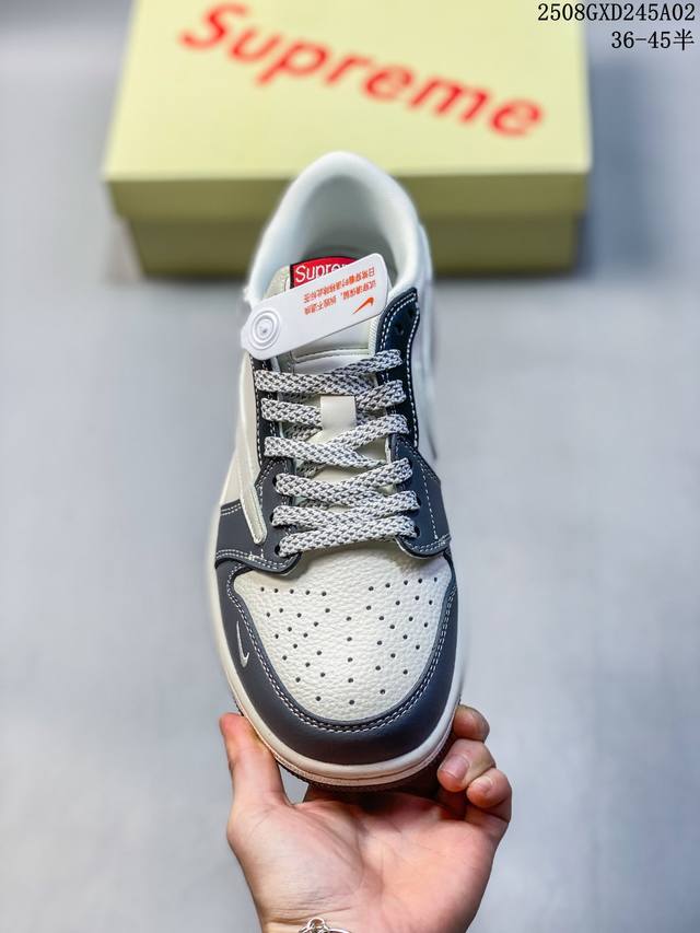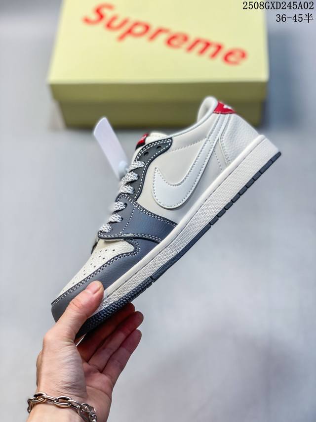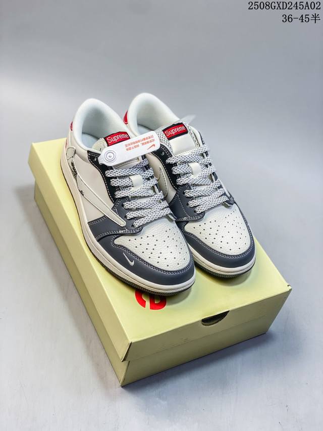 高端定制 Travis Scott X Jordan 1 Low “Supreme联名 米灰黑红尾” 乔丹倒勾低帮休闲板鞋 原厂全头层皮 大厂纯原品质出货 纯正版型 定制鞋盒 皮料切割干净无任何毛边 细节完美 超高清洁度