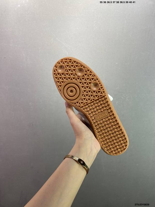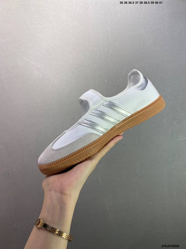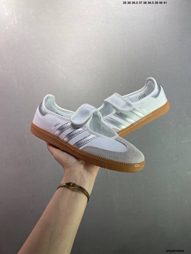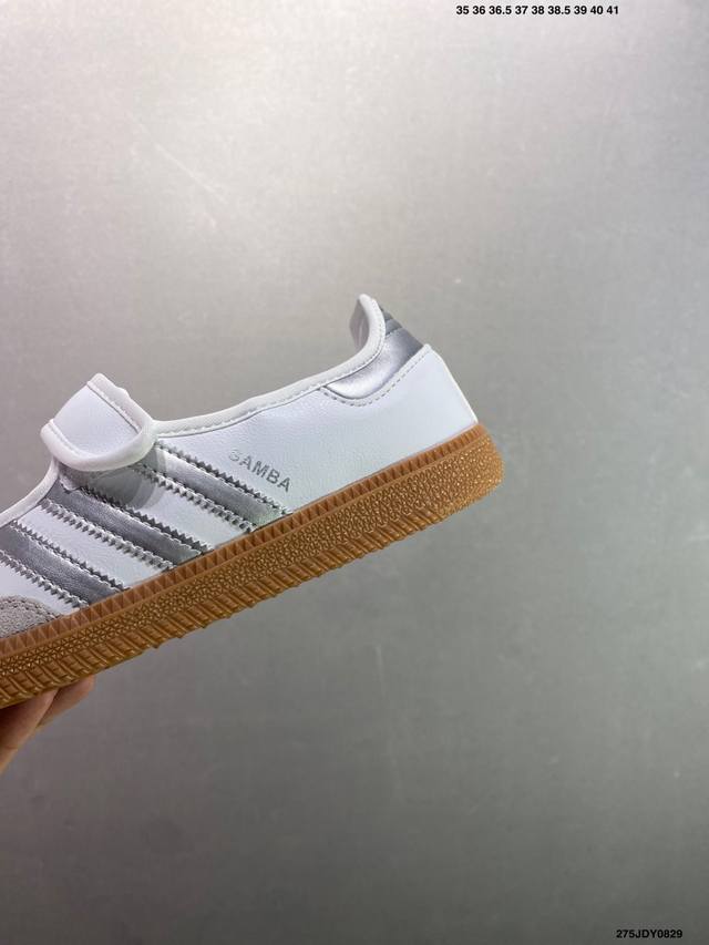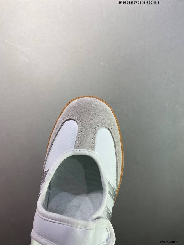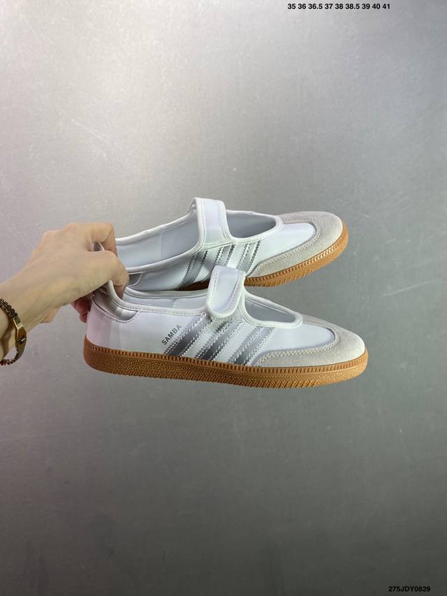 Adidas Samba Janes采用皮革材质,Adidas Samba Janes的设计融合了经典与现代元素。它采用了玛丽珍鞋的特色设计,如鞋面上的扣带和环扣装饰,同时保留了Samba鞋的经典三道杠设计和橡胶大底。这款鞋的鞋型修长,中足偏窄,整体贴合感强,适合标准脚型和宽脚型的人群