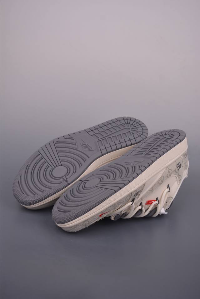 全新的三方联名低帮倒钩鞋面延续了黑脚趾设计,整双鞋以全荔枝皮打造,腰身搭配白色 倒勾 ,再点缀上Travis Scott 标志性的Logo,后跟处以藤原浩最拿手的蓝色为主色调,完善极具Fragment Design的白蓝黑设计风格,左右脚分别以Travis Scott鬼脸和乔丹飞翼加以修饰,彰显出三方联名的奢华格调。