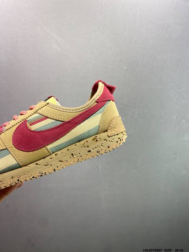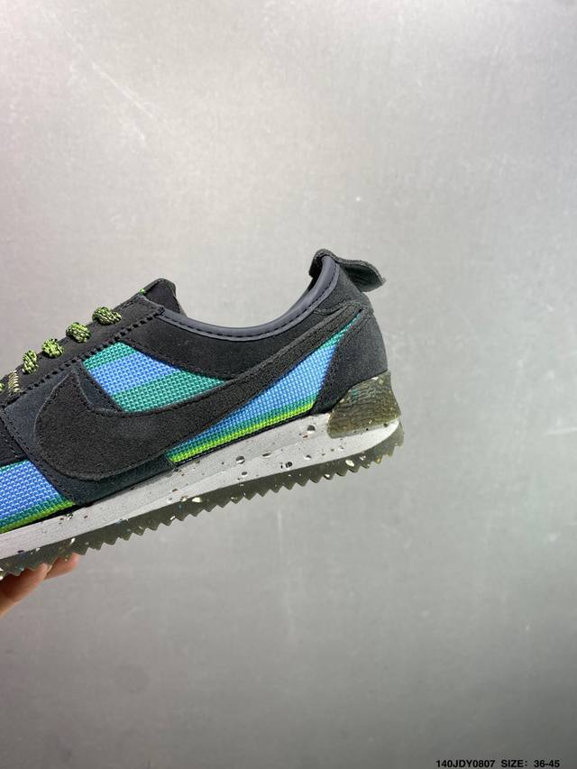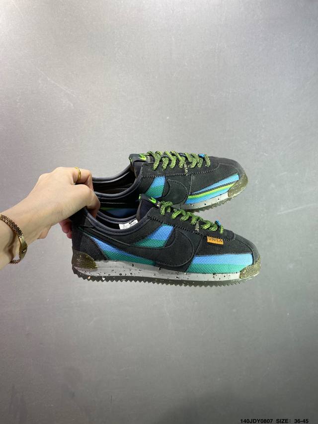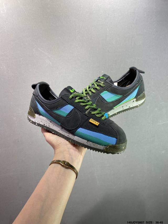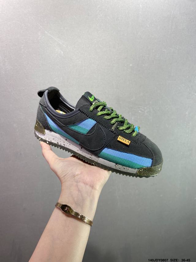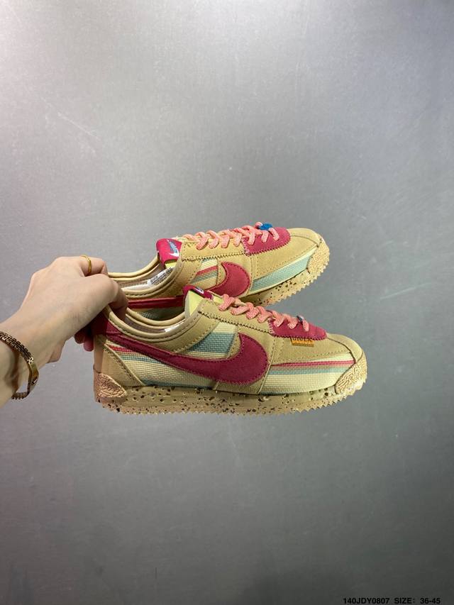 Union La X Nk Cortez 洛杉矶潮店联名 货号:Dr1413 整体延续传统的 阿甘鞋 造型 鞋面采用麂皮打造搭配鞋侧特殊的彩色编织材质 层次感十足 鞋舌处将传统Swoosh 融合 Union 字样进行重新设计 鞋头部位依旧是醒目的 Un La 小标签 手写字体的 Cortez 72 字样鞋带扣 彰显鞋款身份 中底有不规则孔洞设计 外底以锯齿状示人 并且点缀泼墨效果 最大亮点在于后跟一块类似心形的皮牌 同时压印标志性 光环飞人 的标志 细节展现相当精致 Size:36 36.5 37.5 3