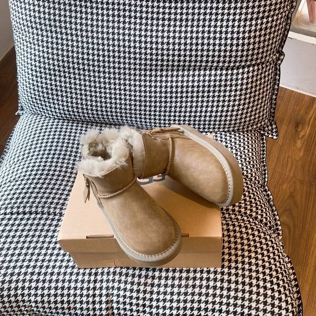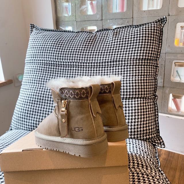 Ugg民族风防水皮拉链款童鞋 羊毛一体儿童雪地靴 内里羊毛,防滑牛筋底 拉链设计 易穿脱 尺码26–35
