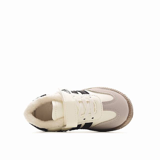 FFF Ad 三叶草 德训加绒童鞋 DDD 采用低帮设计搭配魔术贴穿脱方便,复古造型时尚吸睛,鞋面采用合成皮革+织物拼接材质,轻盈耐磨又透气,适合孩子活泼好动的特点。最亮眼的设计是魔术贴开合系统,方便快捷又稳固,尤其适合幼儿园和小学阶段的小朋友自主穿脱,减轻家长负担。鞋底搭载Eva缓震中底,走路不累脚,支撑性也不错,日常穿它去公园玩一整天都没问题。 DDD 尺码:22-35 DDD 货号:3677白色 DDD