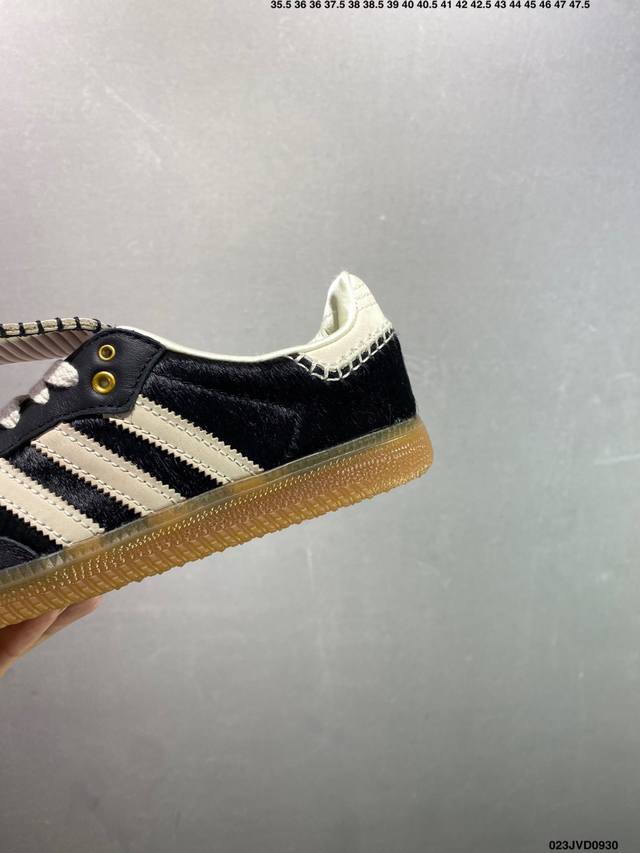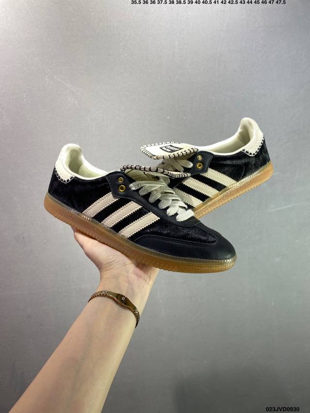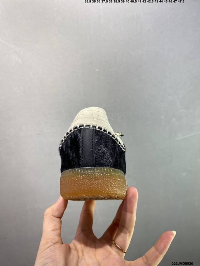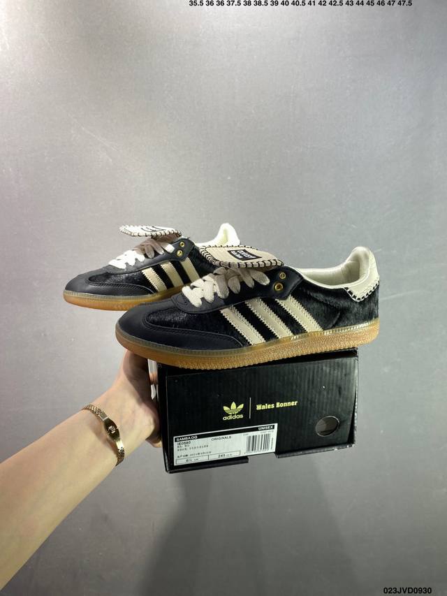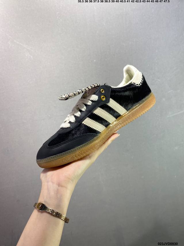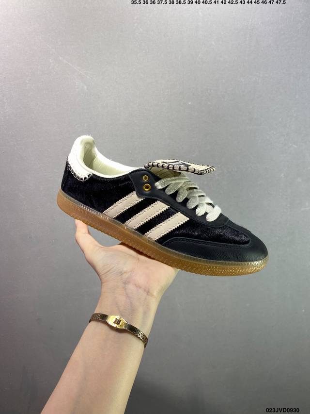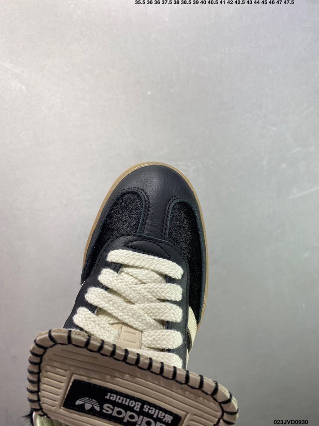 公司级阿迪达斯 德训鞋 经典复古低帮休闲运动慢跑鞋Wales Bonner X Adidas 全新秋冬系列联名鞋款 经典运动板鞋。该鞋超大鞋舌采用毛绒面料制成,含别致缝线设计,灵感源自牙买加手工艺。鞋面缀绒面革和织物拼接细节。含缎面衬里,更添时尚型格。 系带设计 毛绒织物鞋面,配绒面革鞋头和鞋跟饰片 撞色缝线 缎面衬里 生橡胶外底。