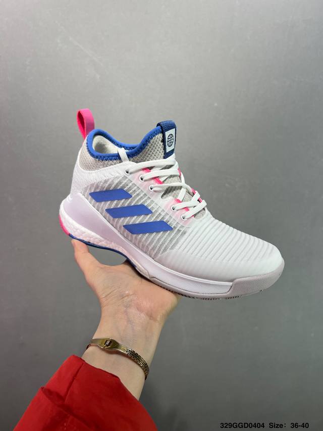 中切设计增加脚踝支撑 采用透气网眼鞋面 弹性袜子般贴合 鞋底3 4处采用 Boost 缓震技术 可实现跳高和软着陆 其周围的合成纤维框架增强了运动到侧面的稳定性