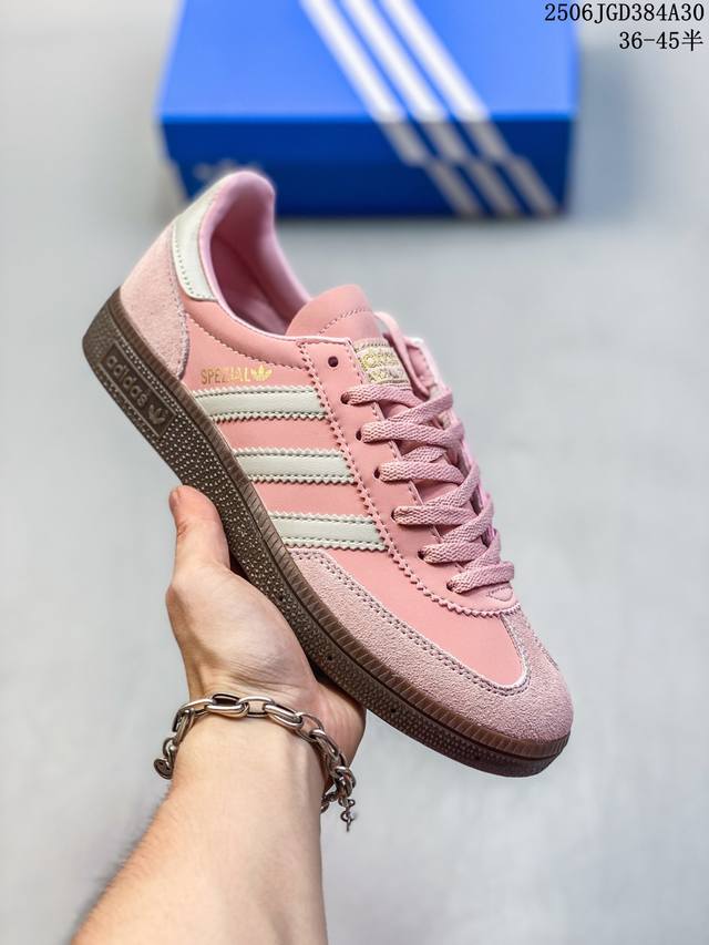 / 阿迪达斯 Adidas Handball Spezial 低帮三叶草学院风复古休闲板鞋 德训鞋 橡胶底柔软皮革经典运动鞋板鞋。圆头、缝合拼接设计、正面绑带、鞋舌