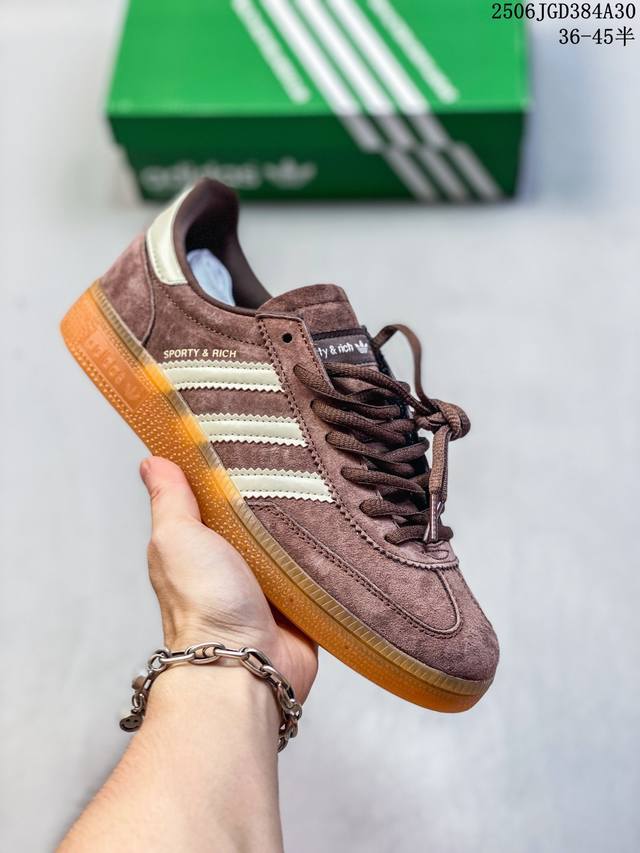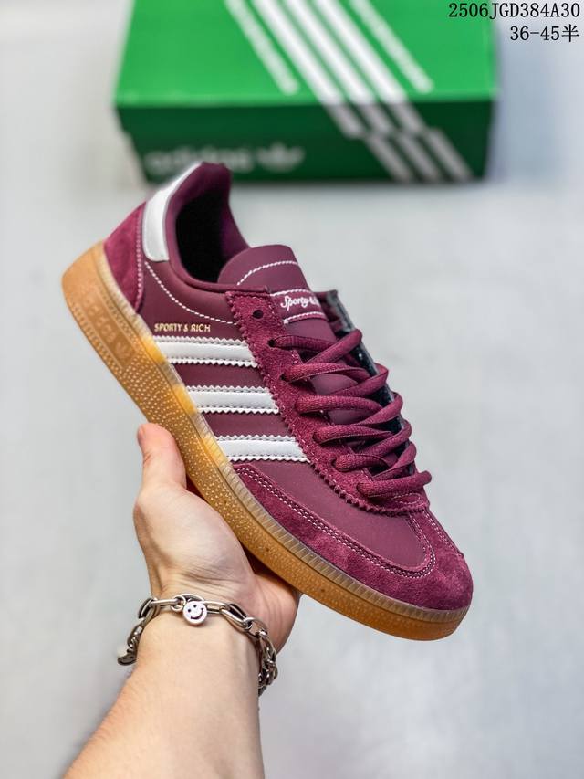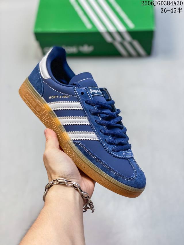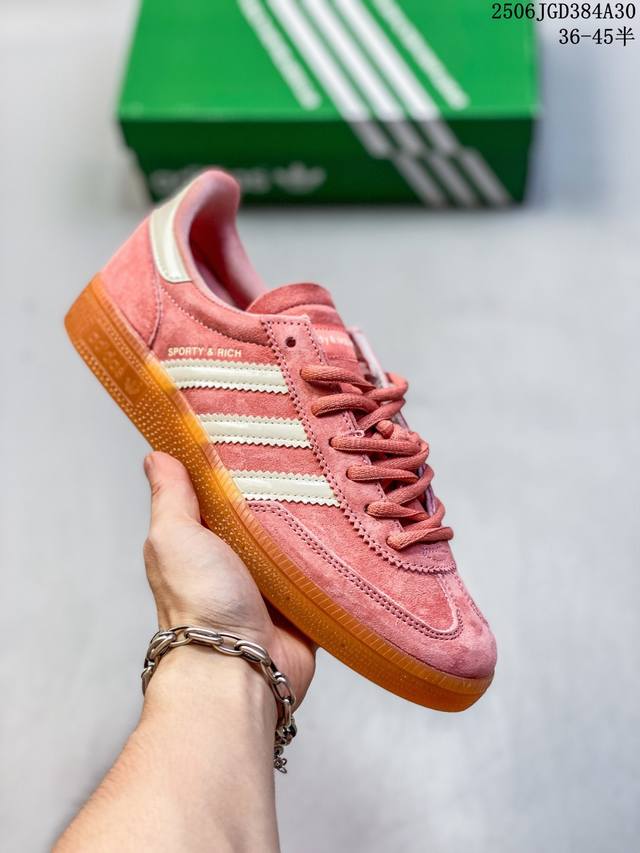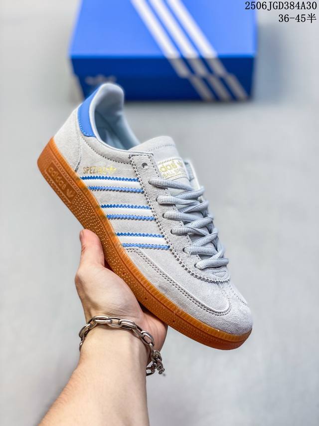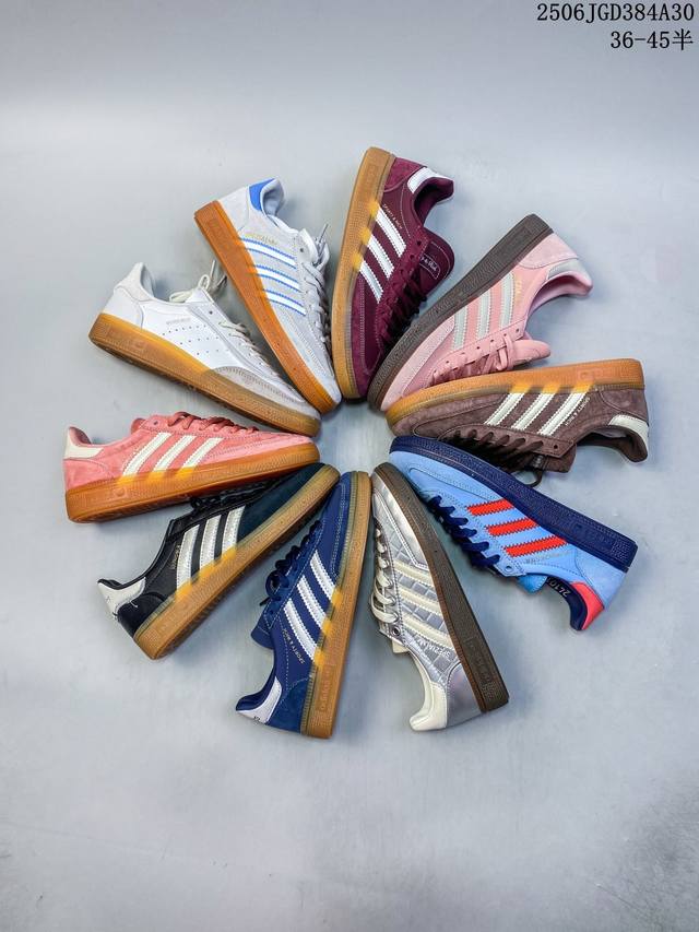 阿迪达斯 Adidas Handball Spezial 低帮三叶草学院风复古休闲板鞋 德训鞋 橡胶底柔软皮革经典运动鞋板鞋。圆头、缝合拼接设计、正面绑带、鞋舌