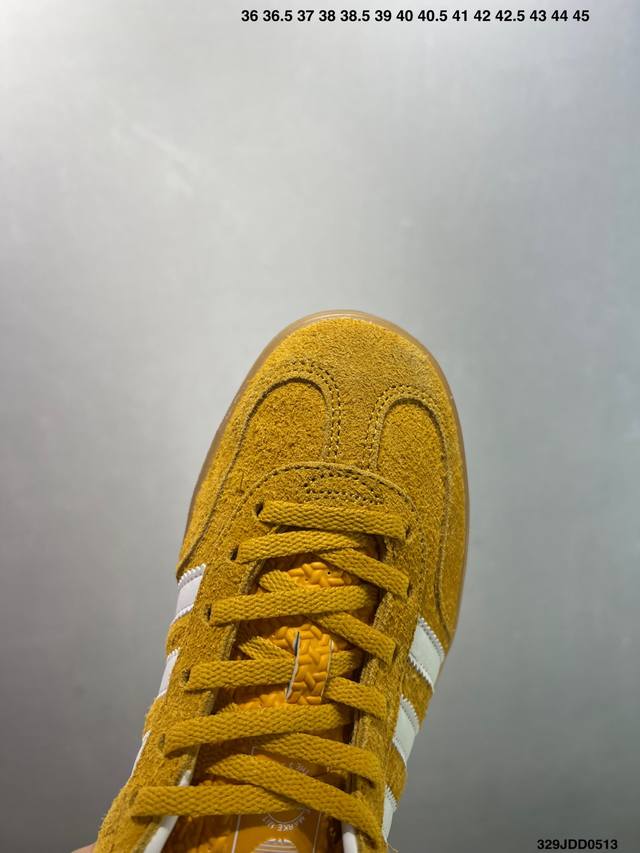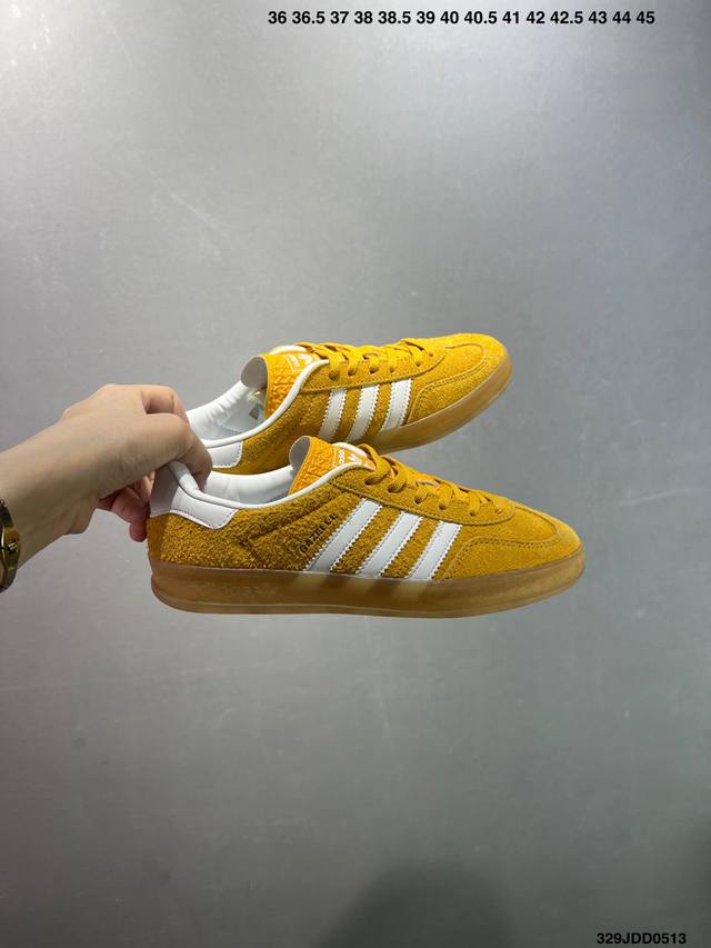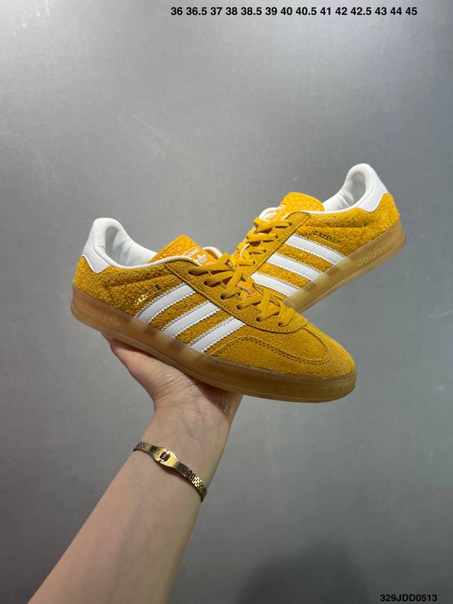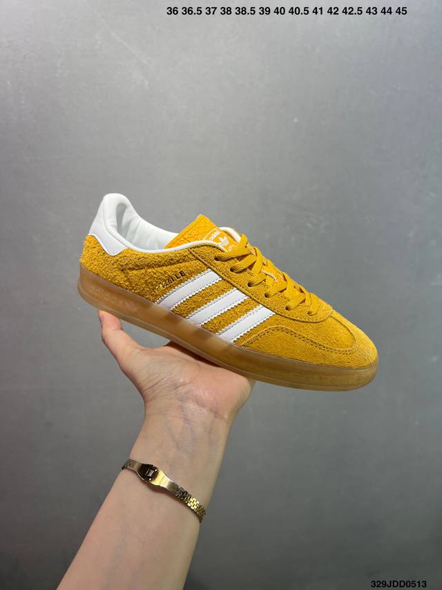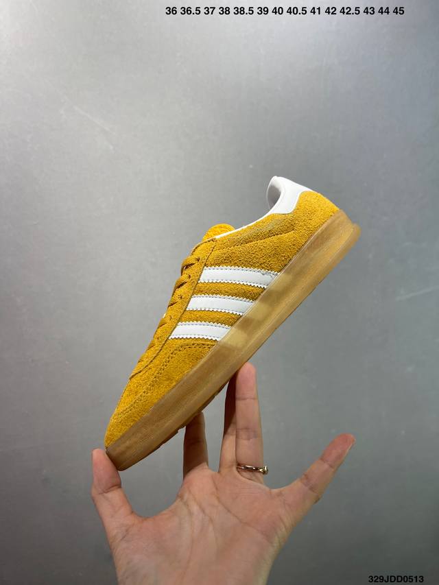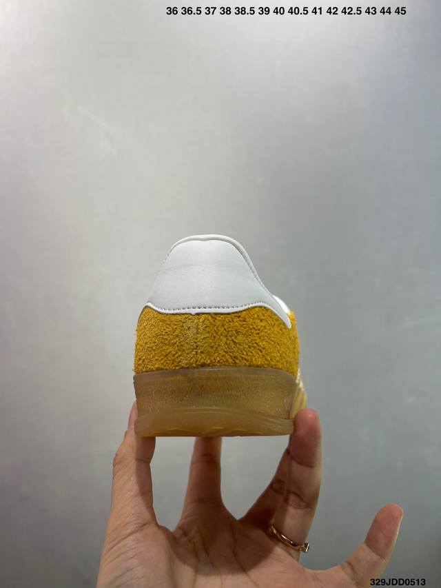 阿迪达斯 Adidas Originals Gazelle Indoor复古三叶草防滑透明橡胶板鞋经典运动鞋。这款经典鞋,忠于原版设计,缀撞色三条纹和鞋跟饰片。采用柔软皮鞋面,穿着舒适,搭配生胶外底,风格复古。用不同材料制作这款修长复古的从1970年代开始就很受欢迎的网球鞋。Gazelle Indoor拥有包边更宽的T字型鞋头,Gazelle开始将皮革材质引入训练鞋设计之中,从而减轻了运动员双脚的负担。当年这一改动也是为了更好的保护运动员的前掌,以及Gucci X Adidas Gazelle 系列就是以