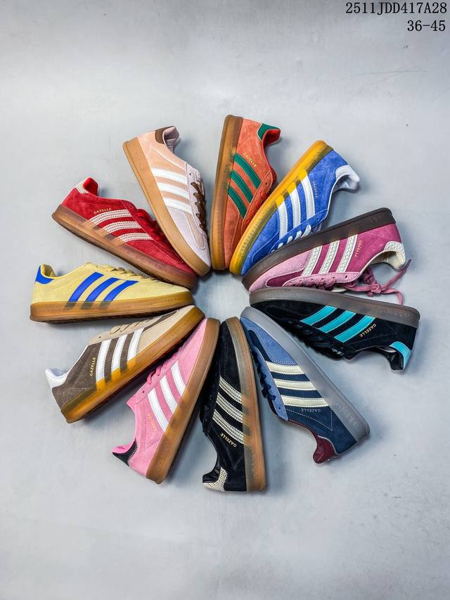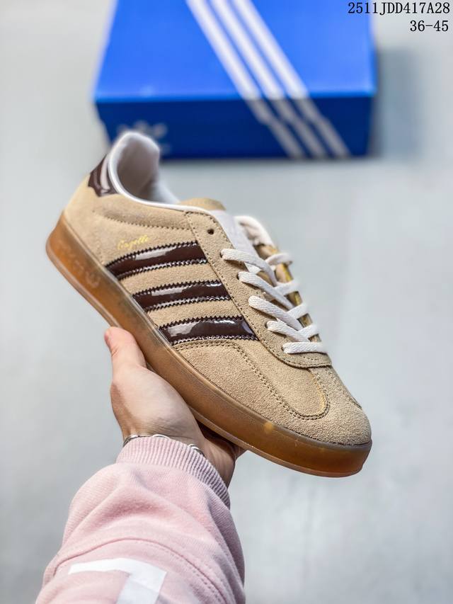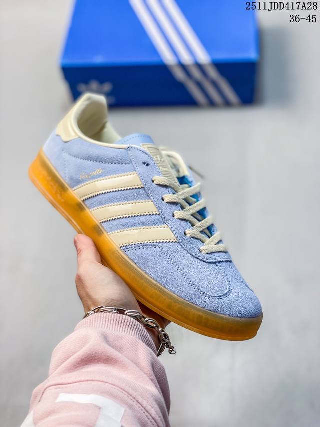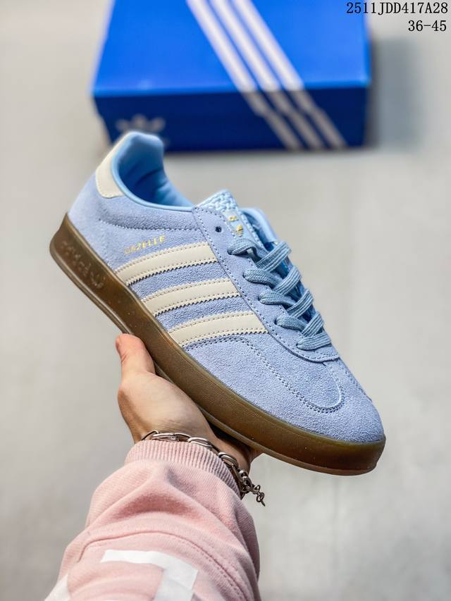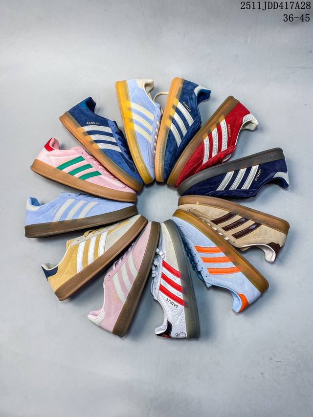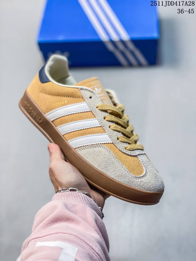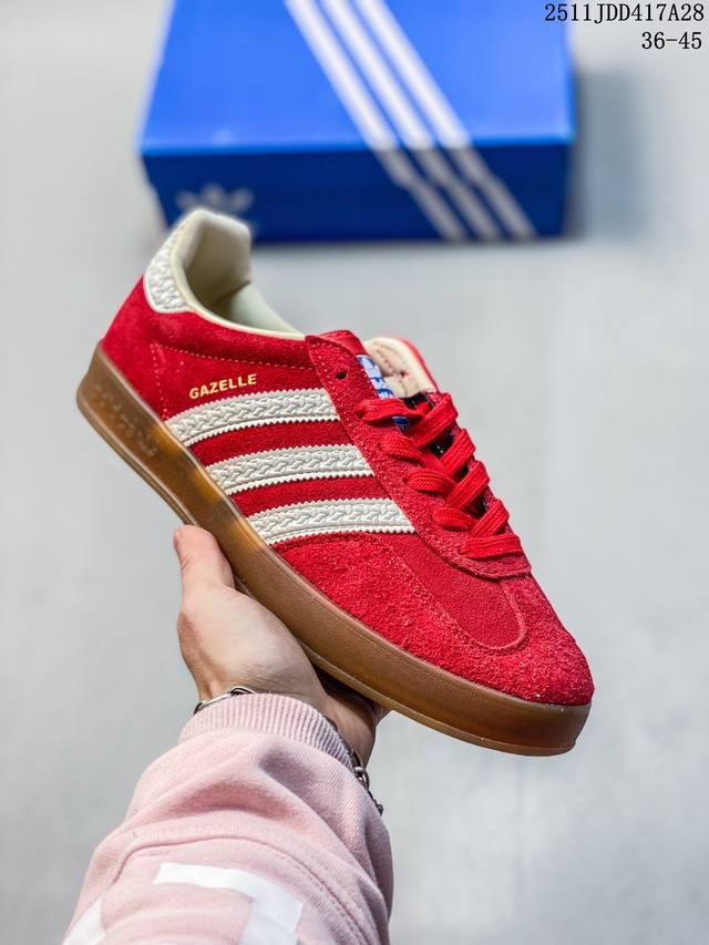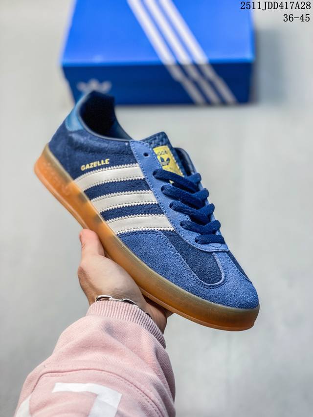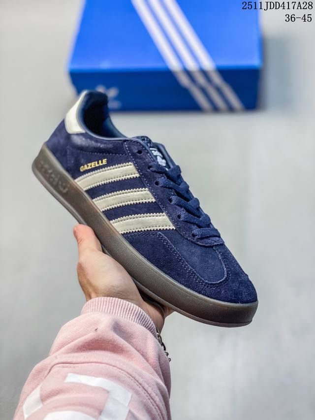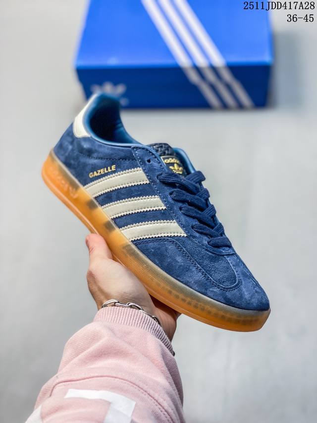 阿迪达斯 Adidas Originals Gazelle Indoor复古三叶草防滑透明橡胶板鞋经典运动鞋 这款经典鞋,忠于原版设计,缀撞色三条纹和鞋跟饰片