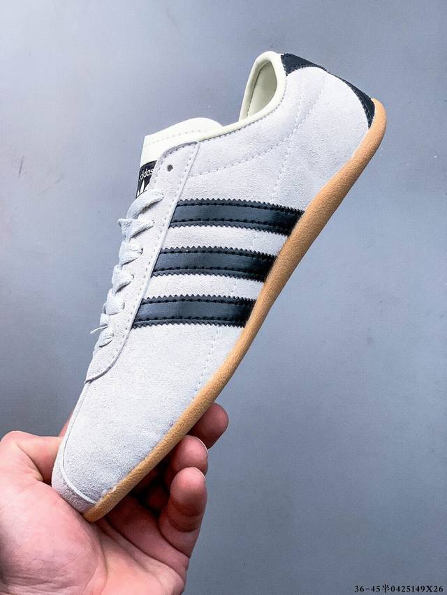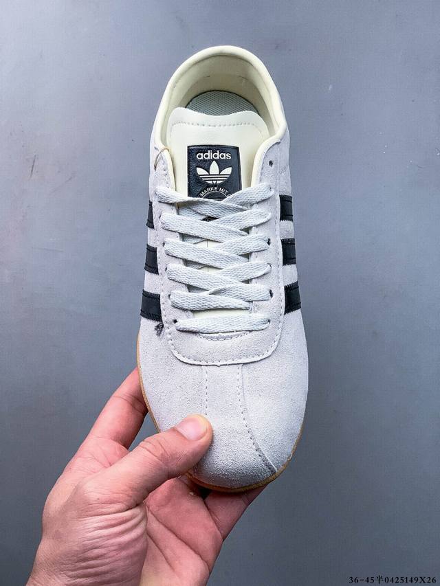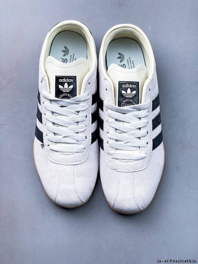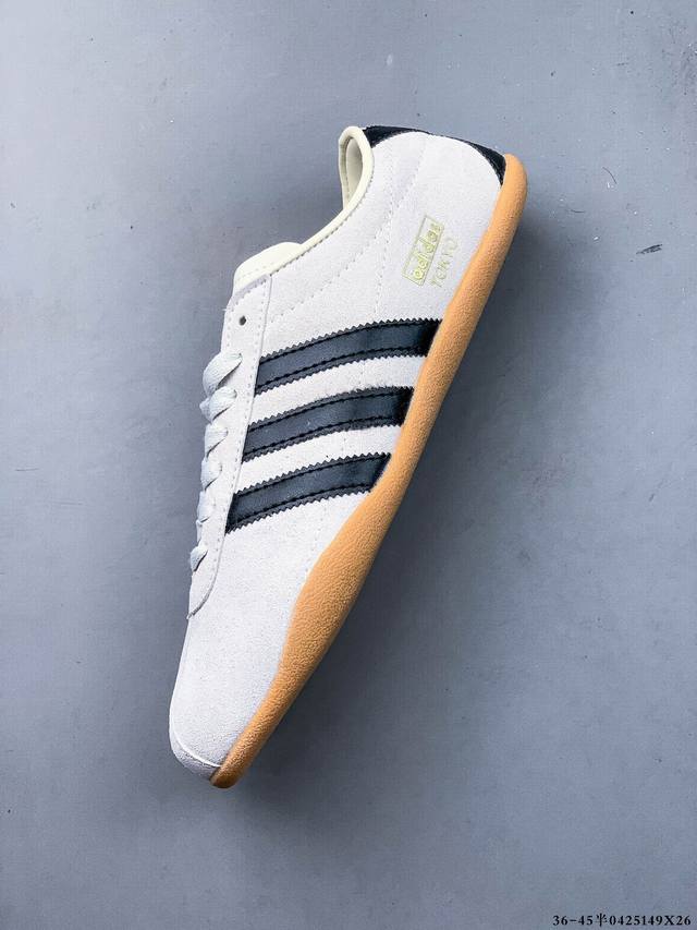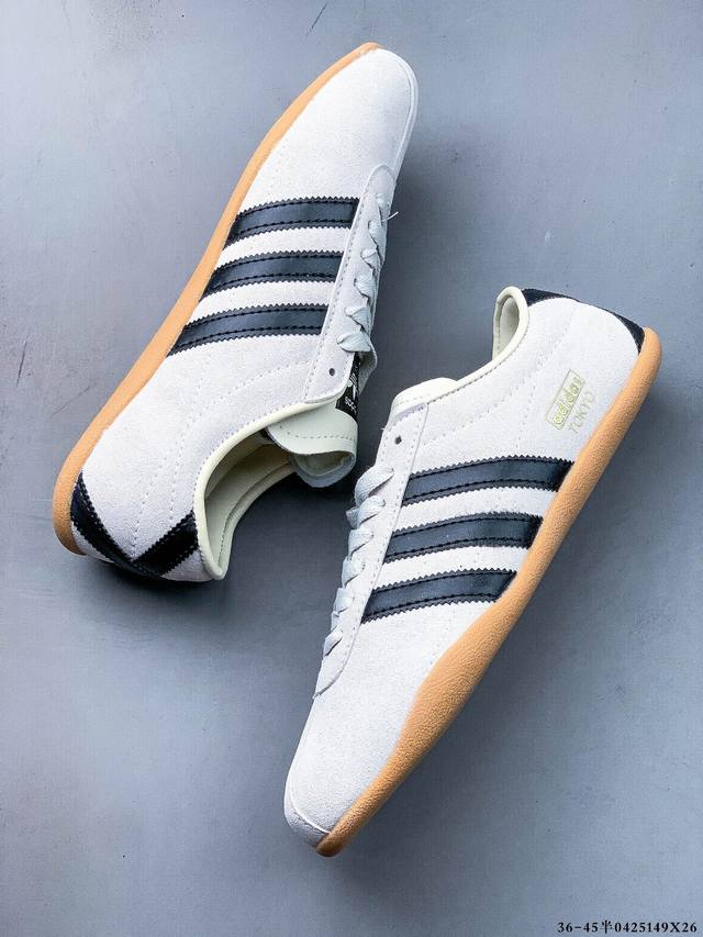 公司级!Adida阿迪达斯Tokyo pack舒适百搭经典休闲运动鞋 此次为Tokyo系列带来三双全新配色,清爽蓝色绒面搭载白色皮革三条纹,增添了复古干净的印象;米白色绒面革搭载黑色皮革三条纹,简约百搭;黑色鞋面辅以白色细节,散发着经典复古视觉。鞋面设计舒适贴合脚面,同时采用柔软材质,穿着轻便舒适。侧面刻有金色的“Adidas Tokyo” 标志,增添辨识度。超薄橡胶外底提供灵活的牵引力,加强抓地力的纹路,具有良好的稳定性和灵活性