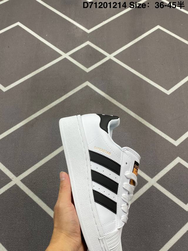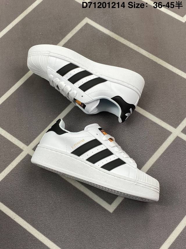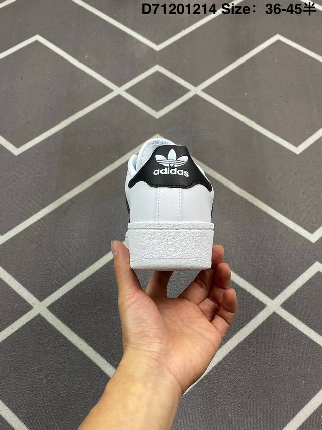 【真标】阿迪达斯/三叶草Adidas Originals Superstar Xlg 贝壳头系列 低帮厚底松糕经典百搭休闲运动板鞋。当你试图定义Adidas Superstar系列,总有大胆设计突破你的想象。这款鞋以70年代经典运动鞋为蓝本,新鲜注入现代时尚元素。加大比例设计,配锯齿状三条纹,个性型格,就是要秀。选用皮革鞋面,不失复古本色,同时以新潮造型重塑经典。含贝壳形鞋头,助你自信迈步。 常规版型 系带设计 皮革鞋面 织物衬里 橡胶外底。