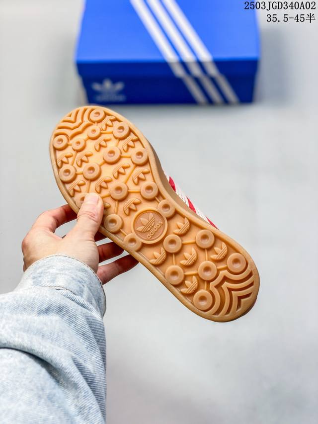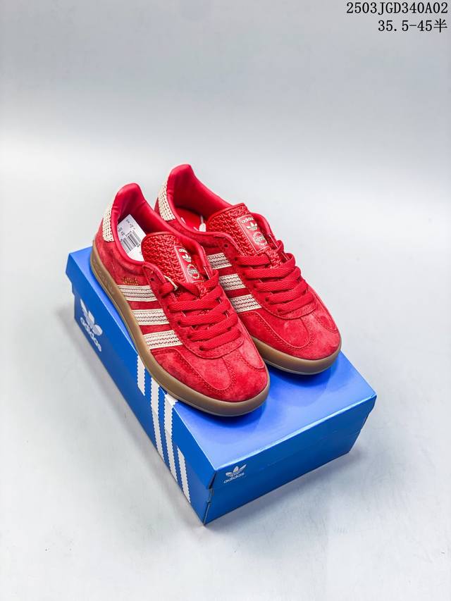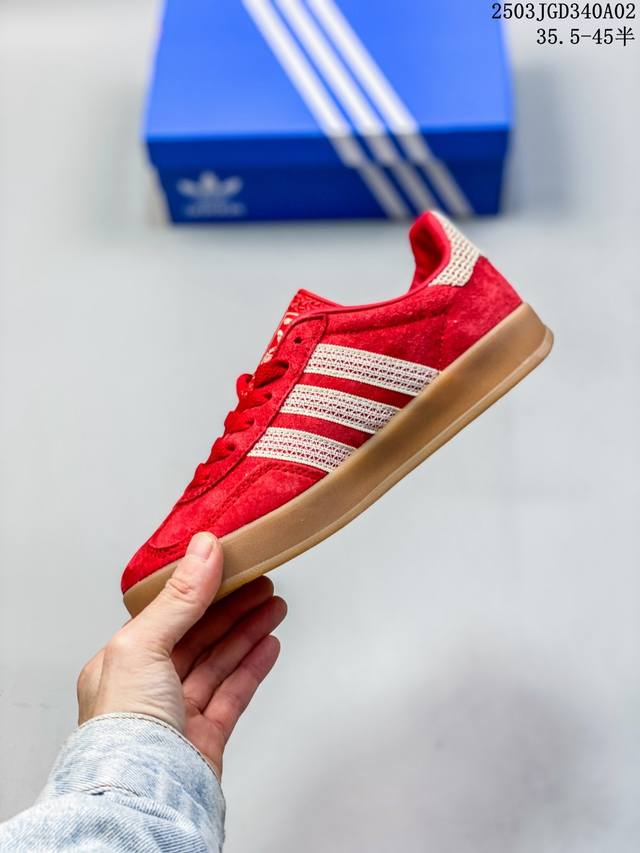阿迪达斯 Adidas Originals Gazelle Indoor复古三叶草防滑透明橡胶板鞋经典运动鞋。这款经典鞋,忠于原版设计,缀撞色三条纹和鞋跟饰片。采用柔软皮鞋面,穿着舒适,搭配生胶外底,风格复古。用不同材料制作这款修长复古的从1970年代开始就很受欢迎的网球鞋。Gazelle Indoor拥有包边更宽的T字型鞋头,Gazelle开始将皮革材质引入训练鞋设计之中,从而减轻了运动员双脚的负担。当年这一改动也是为了更好的保护运动员的前掌,以及Gucci X Adidas Gazelle