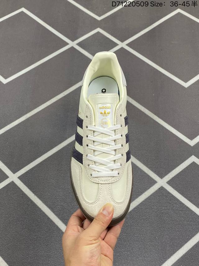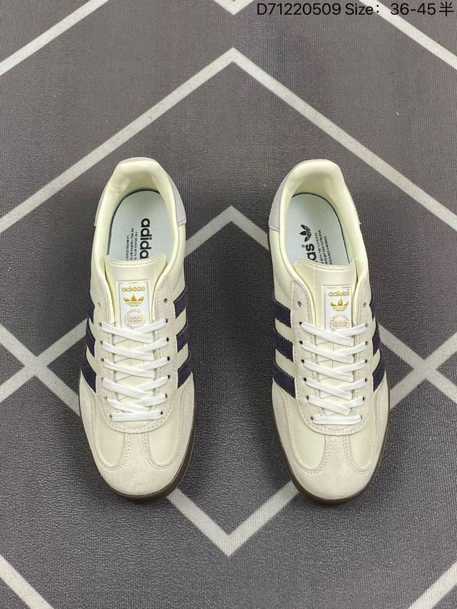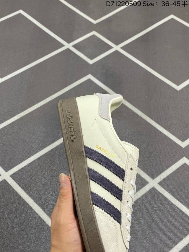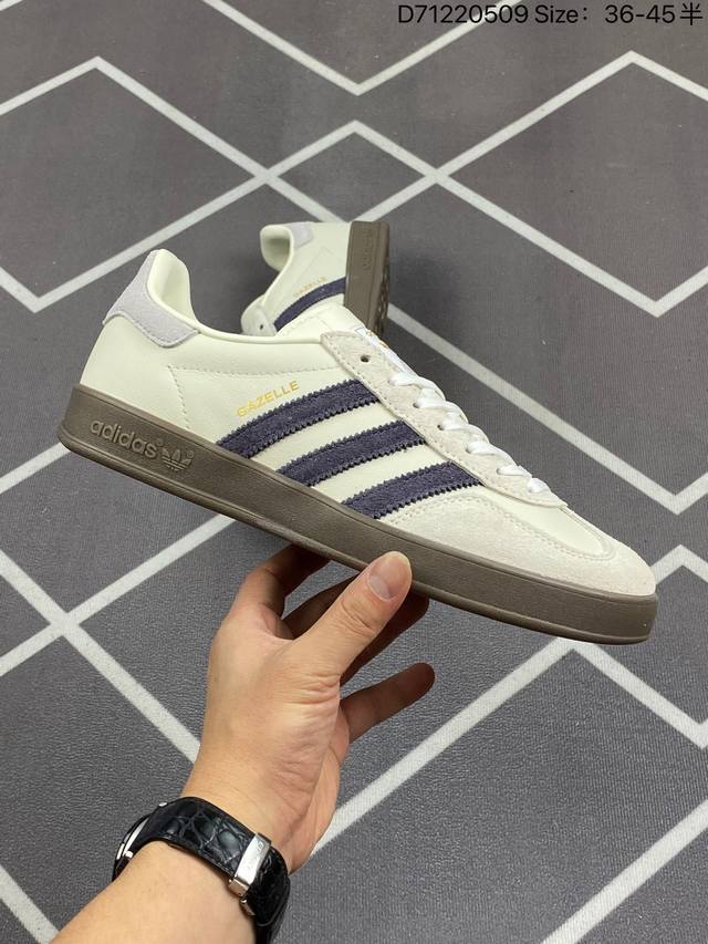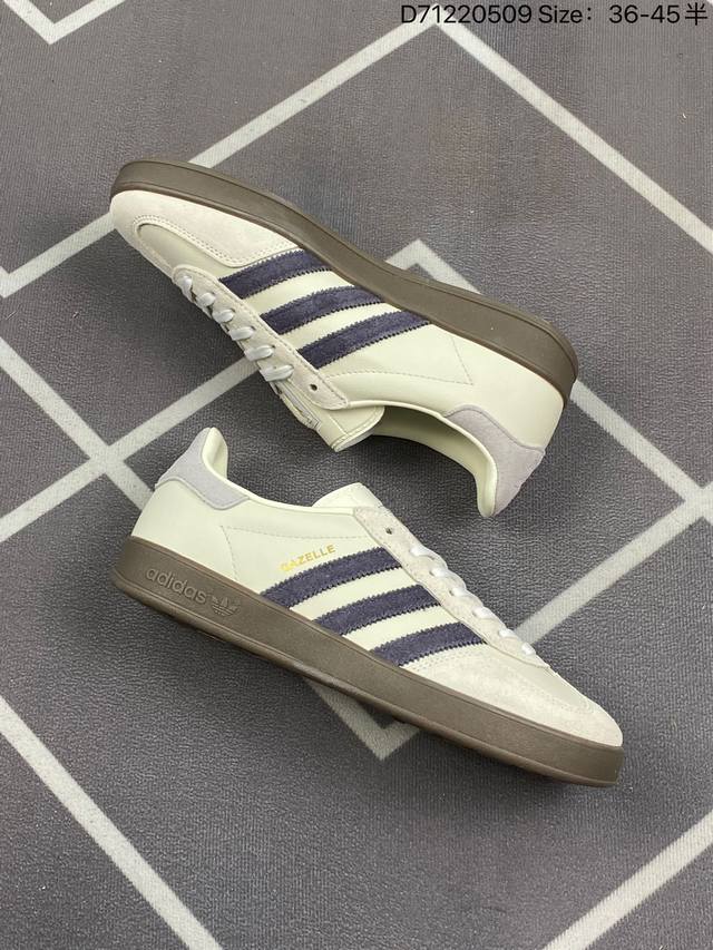 阿迪达斯 Adidas Originals Gazelle Indoor 复古三叶草防滑透明橡胶板鞋经典运动鞋。这款经典鞋,忠于原版设计,缀撞色三条纹和鞋跟饰片。采用翻毛皮皮革鞋面,穿着舒适,搭配生胶外底,风格复古。用不同材料制作这款修长复古的从1970年代开始就很受欢迎的网球鞋。Gazelle Indoor拥有包边更宽的T字型鞋头,Gazelle开始将皮革材质引入训练鞋设计之中,从而减轻了运动员双脚的负担。当年这一改动也是为了更好的保护运动员的前掌,以及Gucci X Adidas Gaze