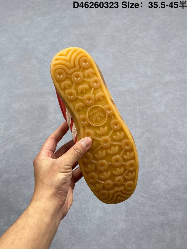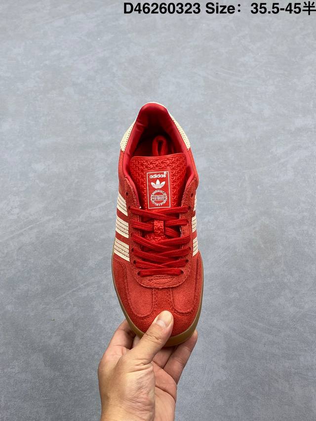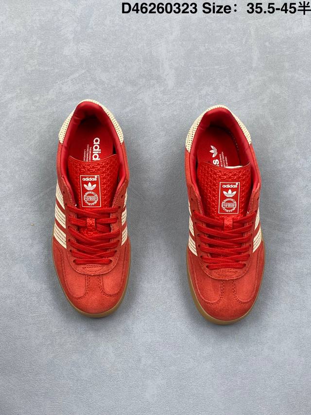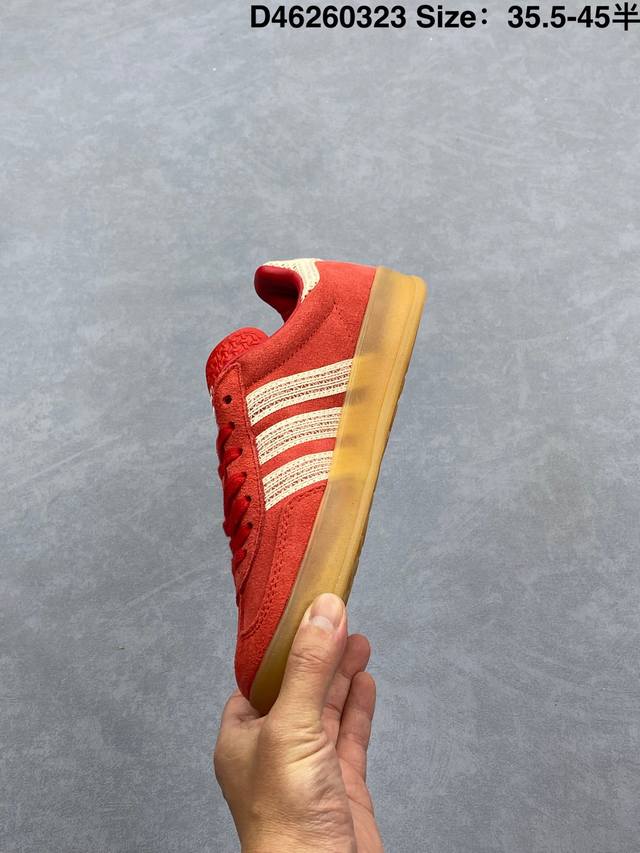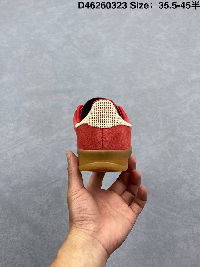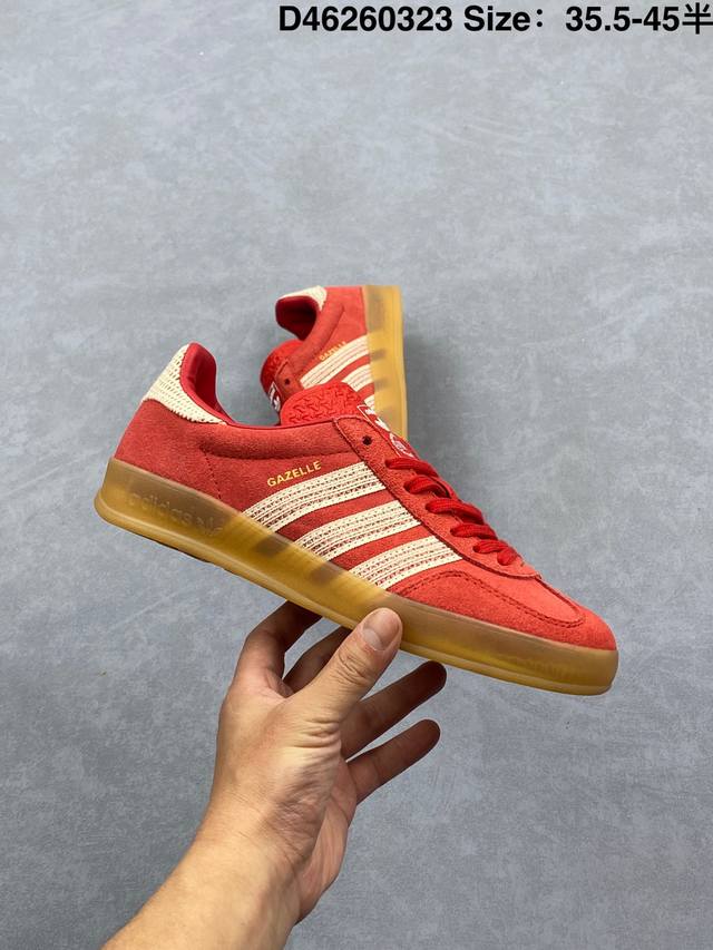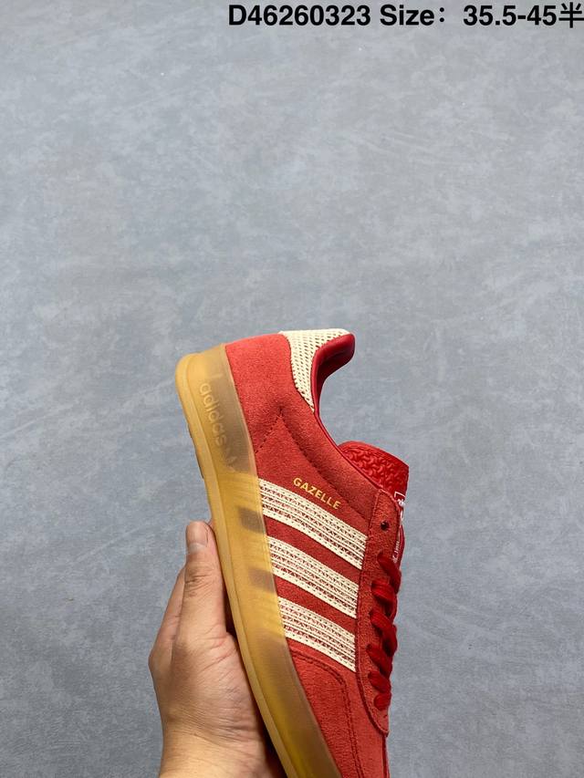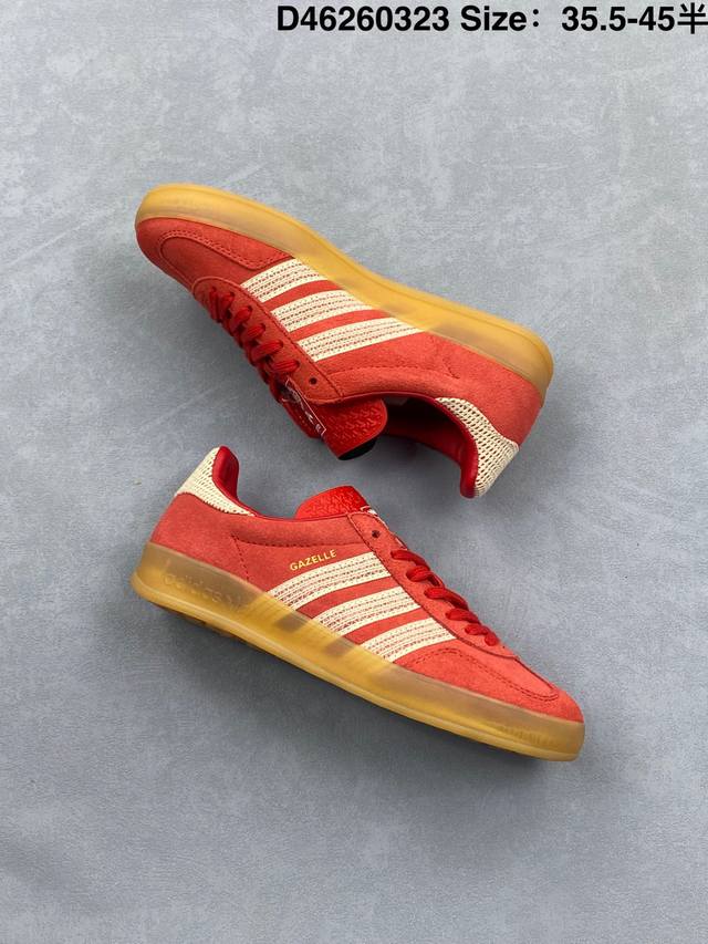 阿迪达斯 Adidas Originals Gazelle Indoor复古三叶草防滑透明橡胶板鞋经典运动鞋。这款经典鞋,忠于原版设计,缀撞色三条纹和鞋跟饰片。采用柔软皮革鞋面,穿着舒适,搭配生胶外底,风格复古。用不同材料制作这款修长复古的从1970年代开始就很受欢迎的网球鞋。Gazelle Indoor拥有包边更宽的T字型鞋头,Gazelle开始将皮革材质引入训练鞋设计之中,从而减轻了运动员双脚的负担。当年这一改动也是为了更好的保护运动员的前掌,以及Gucci X Adidas Gazelle