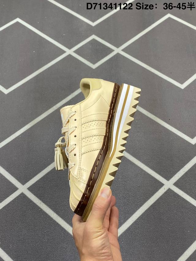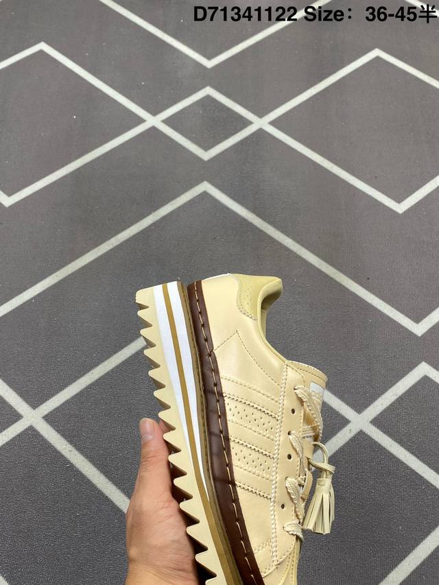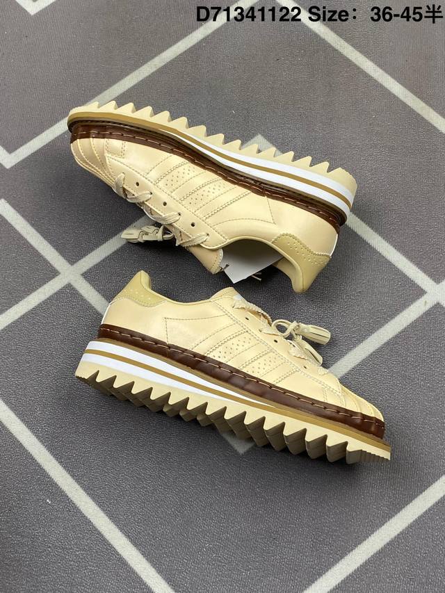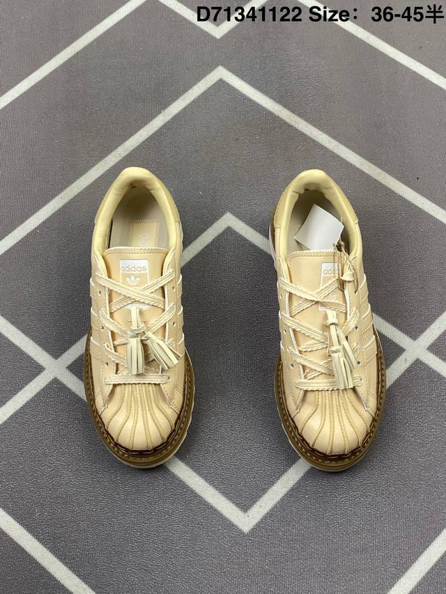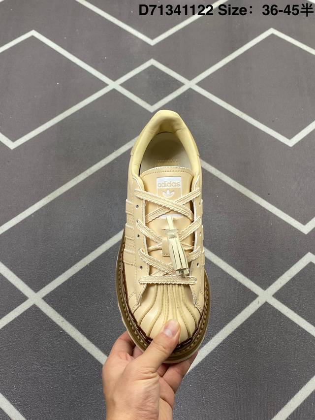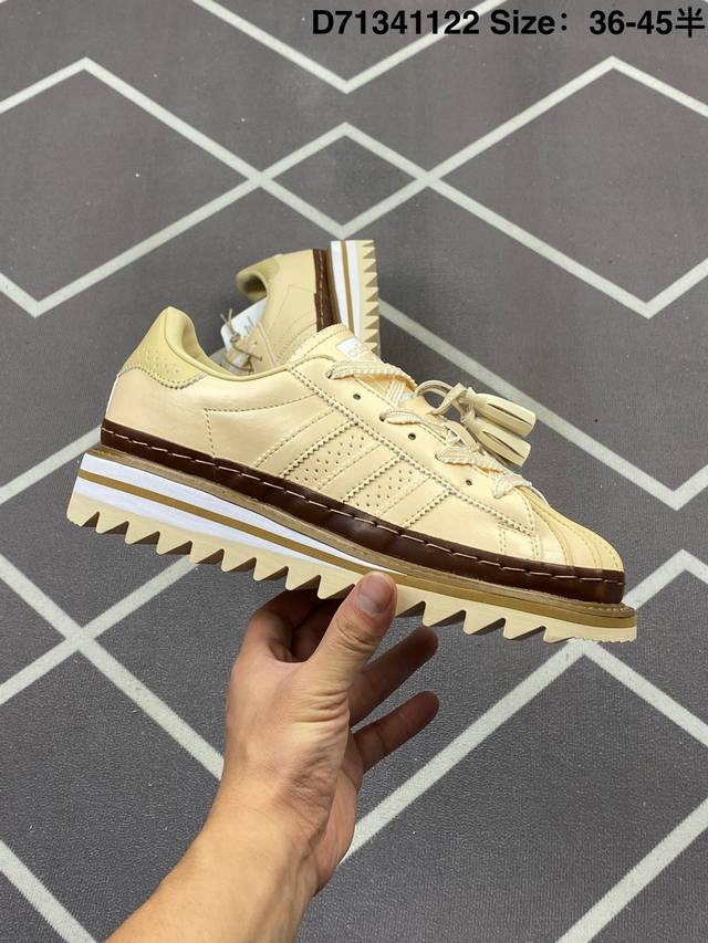 【公司级】阿迪达斯 Clot X Adidas Originals Superstar 陈冠希全新设计 运动休闲厚底增高板鞋,鞋身整体以Adidas经典的"Superstar"为蓝本设计 将标志性的贝壳头重新演绎,鞋舌部分还带有特殊的流苏细节上面带有双方Logo 彰显联名身份 ,最大的亮点就是鞋底部分 ,除了中底增高外还带有特殊的"鲨鱼锯齿"设计。