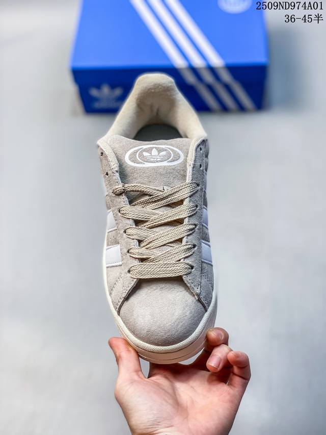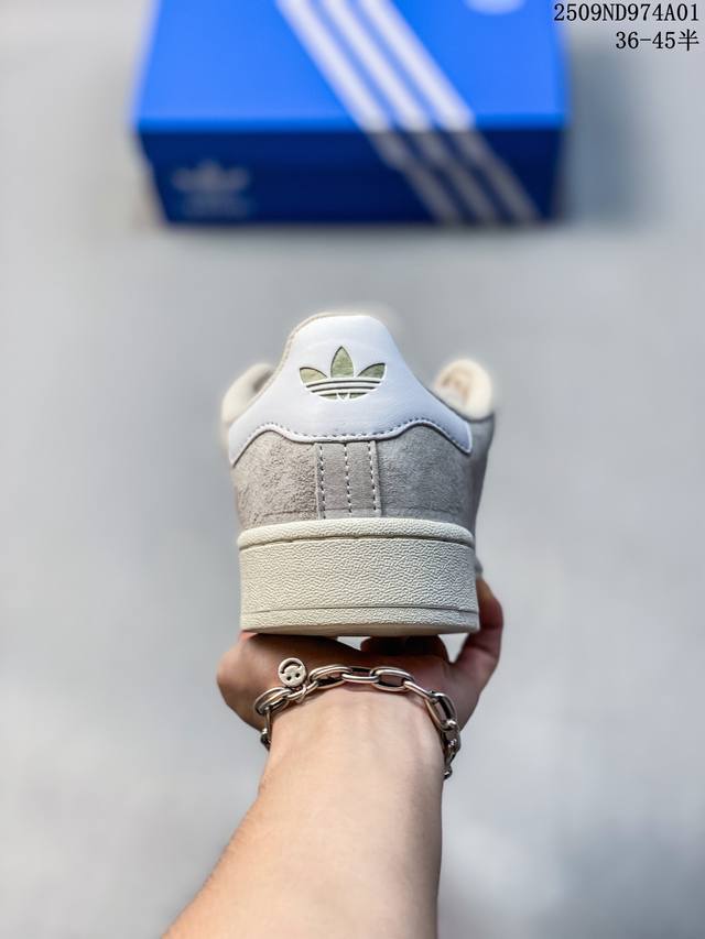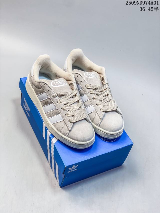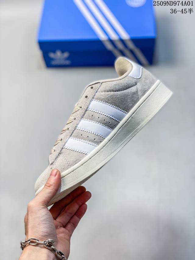 Adidas阿迪达斯.三叶草Campus 00S 面包鞋复古休闲板鞋。千禧回潮!Adidas Campus 00S 经典再现!面包化的Campus鞋款在今年受到很多人的喜爱。鞋款整体设计在保有原型设计中经典的三叶草Logo及三条纹设计的同时,放大了整体鞋身、鞋带和三条纹比例。同时鞋身填充棉部分用料扎实、较为厚重,这也使得鞋舌部分不会轻易移位或弯折。同时鞋面切割与走线部分处理十分精细,皮面拼接部分边缘切割也十分整洁,保证了个性化设计的同时做工细致。