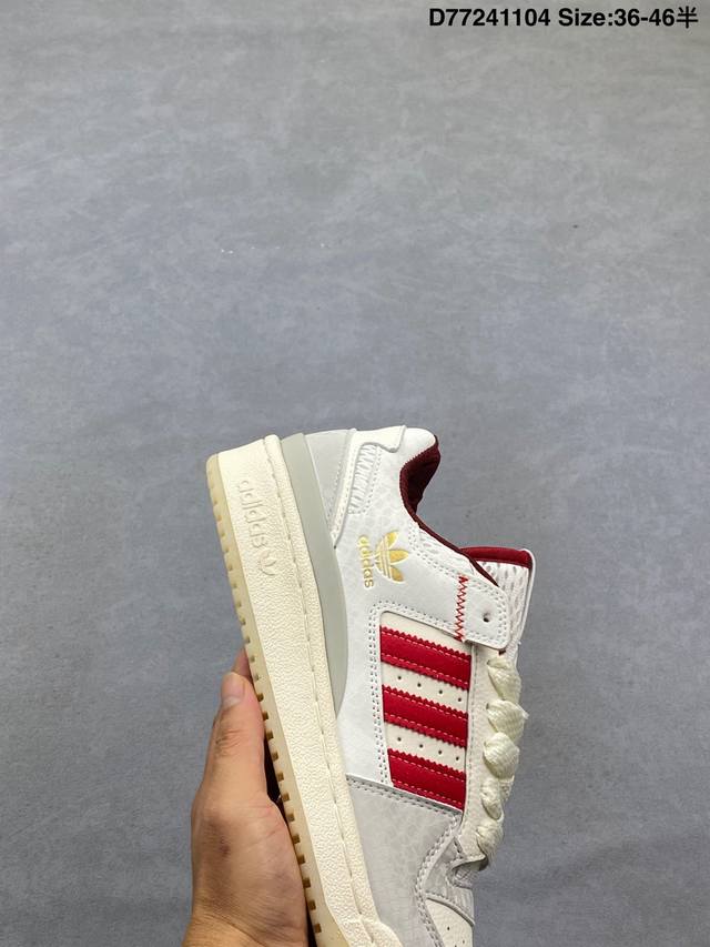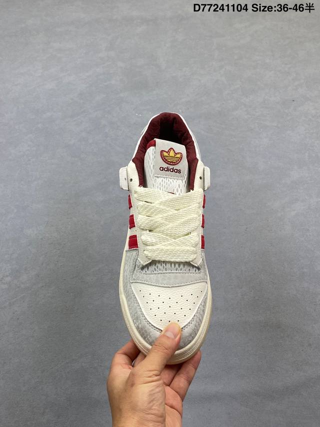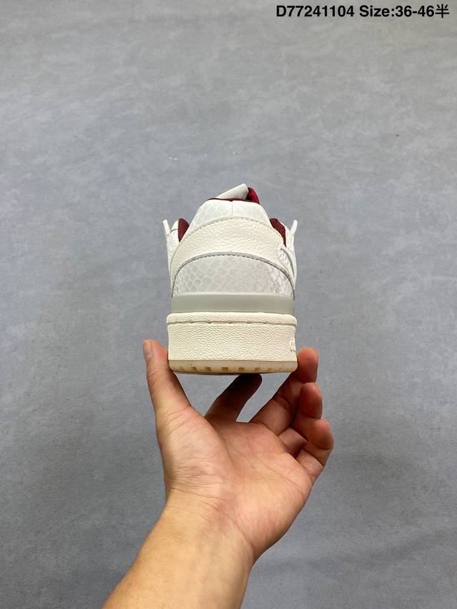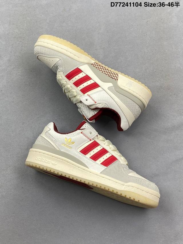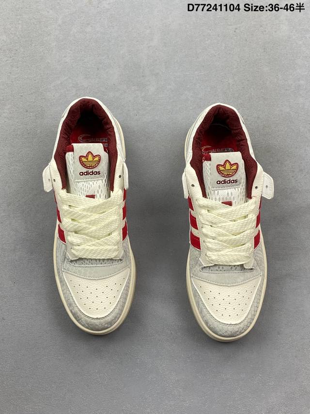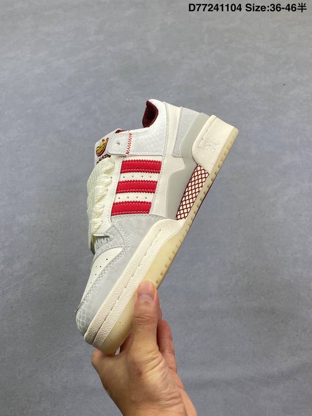 Adidas 阿迪达斯 三叶草 Forum Low 男女运动板鞋 2025年新款 蛇年限定 摩登演绎篮球风的经典鞋。英文的“Forum”,是进行表达的场所,在这里,可以释放自己的热情,阐述自己的观点。1984年,Adidas Forum的诞生,正是基于这一概念。它以张扬造型在球场上“崭露头角”,致力于助球员突破自我,再创佳绩。这款Adidas Forum低帮绒面革经典鞋,无论球场内外,力求引人注目。全力以赴吧。 部分采用再生材料打造,旨在减少塑料废弃物污染。部分鞋面采用再生材料。 系带设计,配魔术贴粘扣带