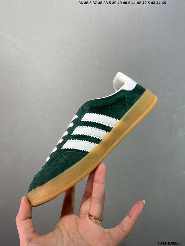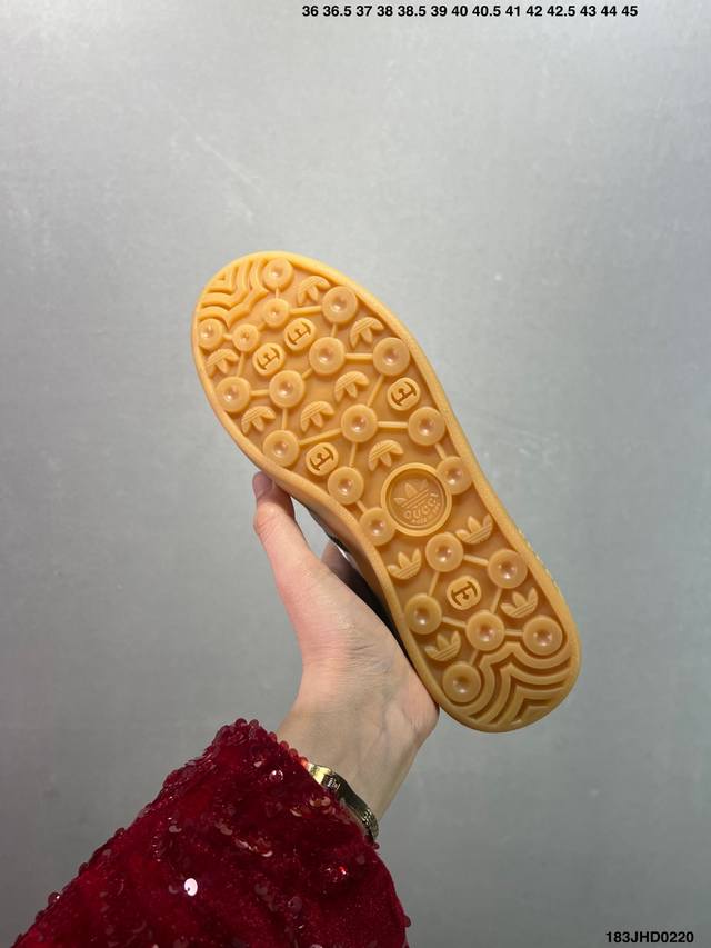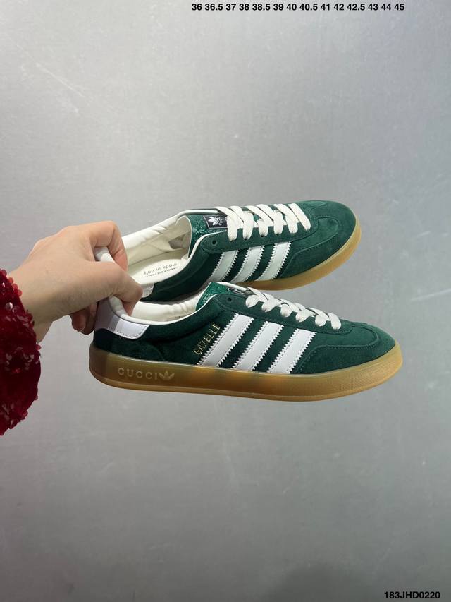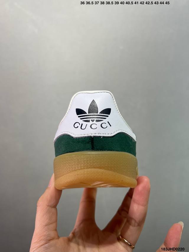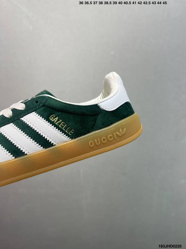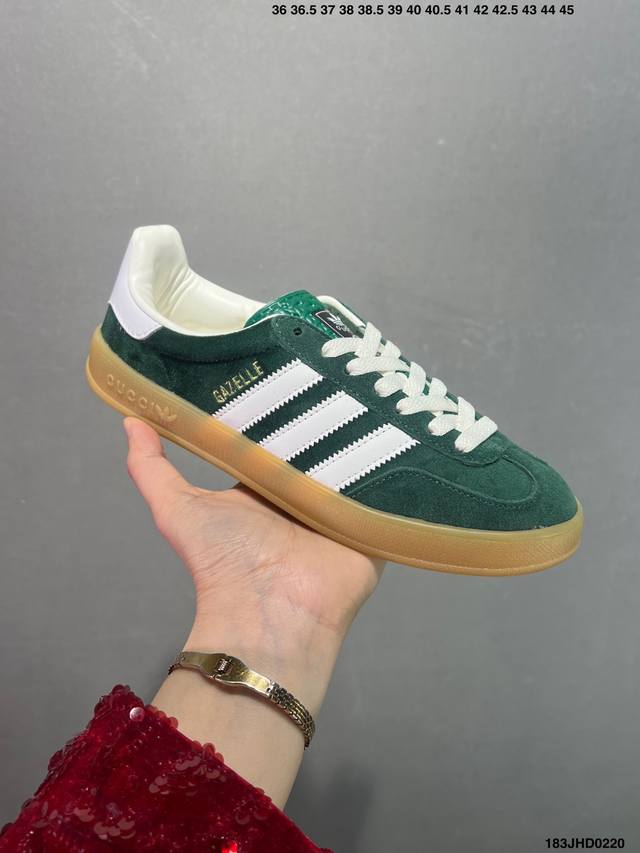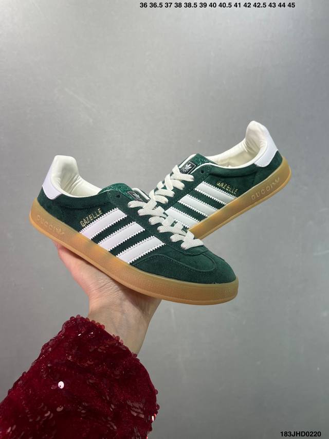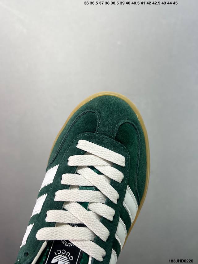 Adidas 阿迪达斯 男女鞋半码制,采用翻毛皮与牛剖革鞋面材质,皮革内里贴缓震Pu乳胶脚垫,外置耐磨大底 “复古运动”最新跨界联名,意大利奢侈品牌-古驰Gucci X 德国运动品牌阿迪达斯Adidas Originals Gazelle”Esquisite Gucci“羚羊系列低帮复古百搭休闲运动板鞋 726487