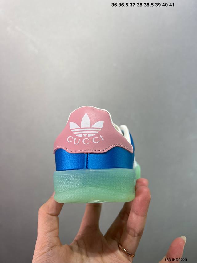Adidas 阿迪达斯 男女鞋半码制,采用翻毛皮与牛剖革鞋面材质,皮革内里贴缓震Pu乳胶脚垫,外置耐磨大底 “复古运动”最新跨界联名,意大利奢侈品牌-古驰Gucci X 德国运动品牌阿迪达斯Adidas Originals Gazelle”Esquisite Gucci“羚羊系列低帮复古百搭休闲运动板鞋 726487