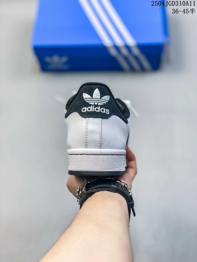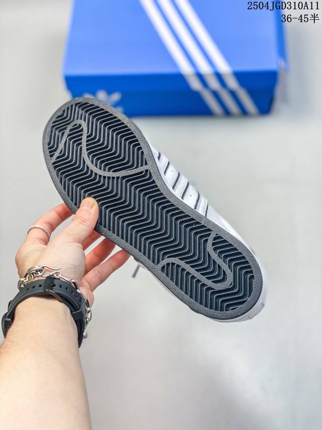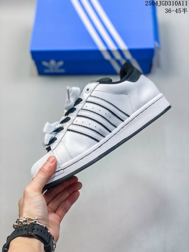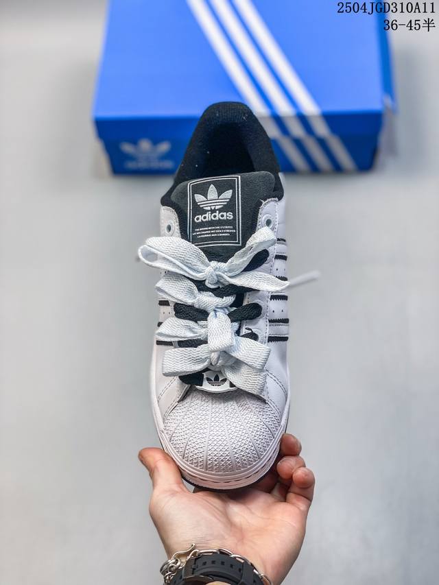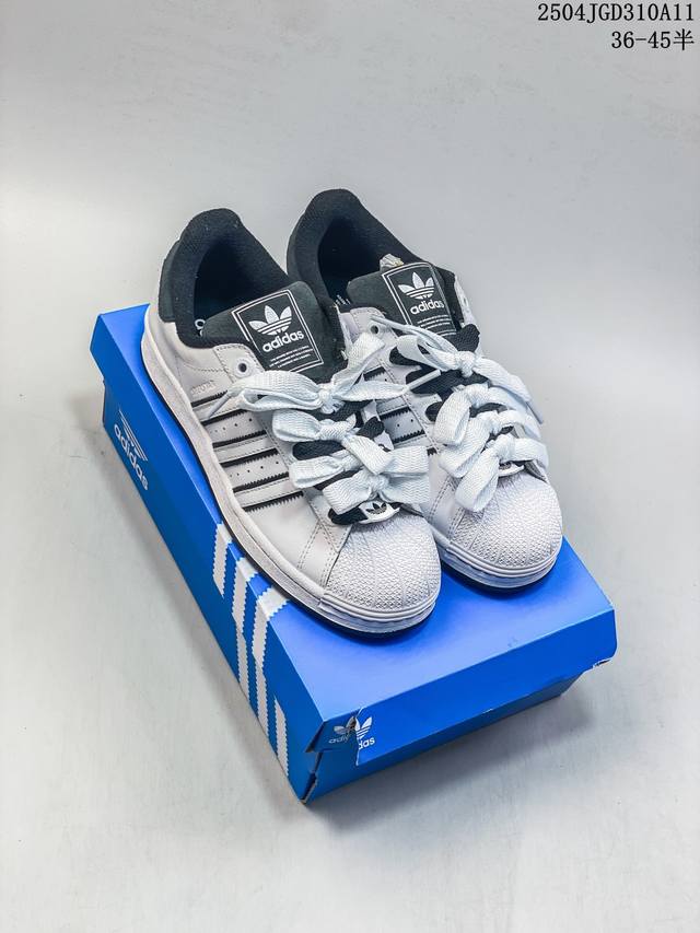 Adidas Originals Superstar诞生于1969年,是第一双将全皮面鞋身与橡胶鞋头结合在一起的低帮篮球鞋,Superstar最开始 是作为高帮篮球鞋Promodel的低帮版本而出现的,但因为其独特和醒目的橡胶鞋头造型而让大家熟知,被大家形象地称为“Shelltoe”贝壳头。在70年代的美国职业篮球场上,接近3 4的Nba球员都将这双Superstar作为场上用鞋,80年代