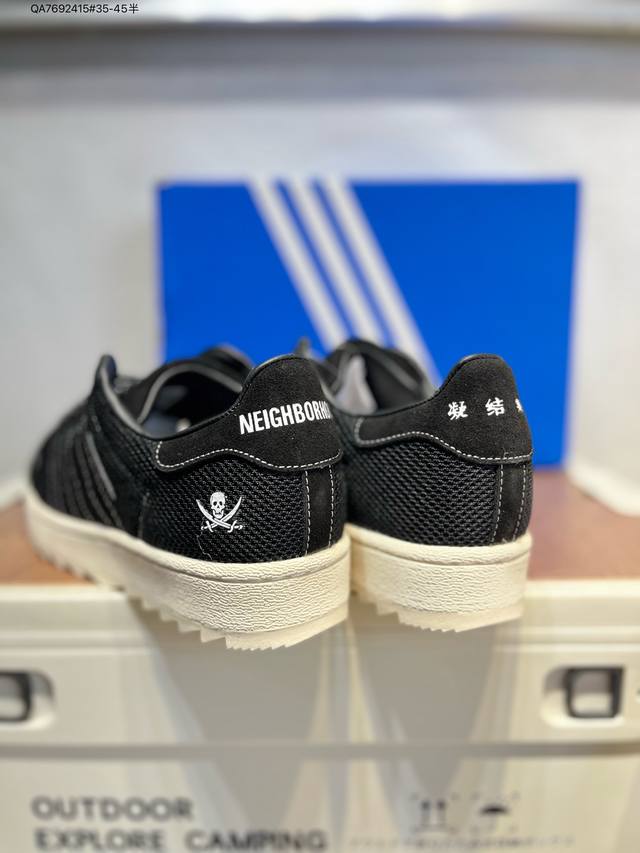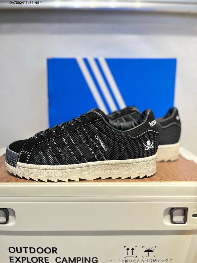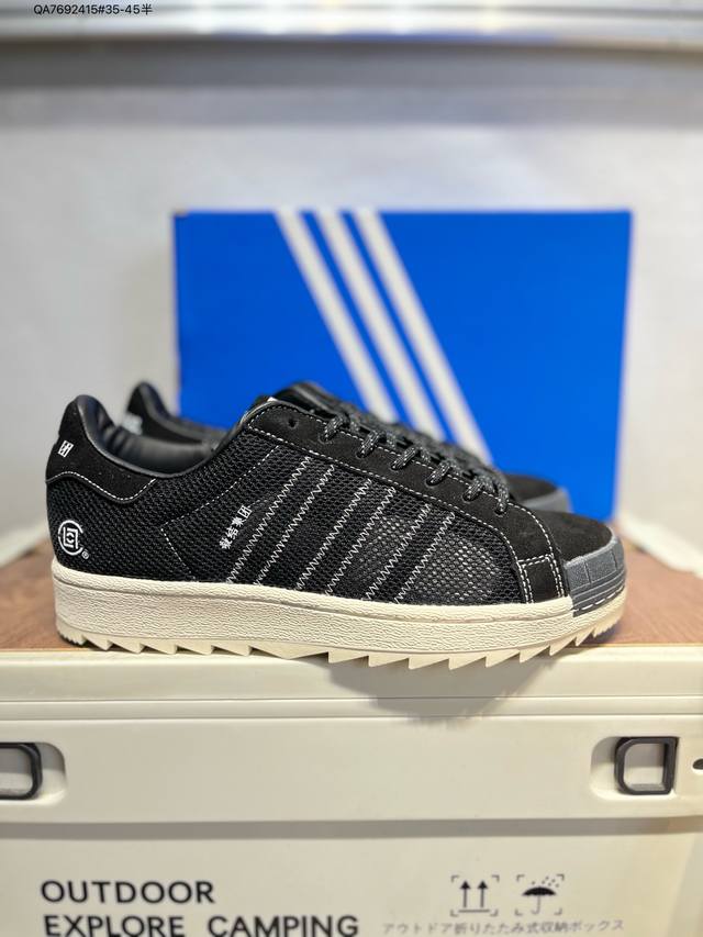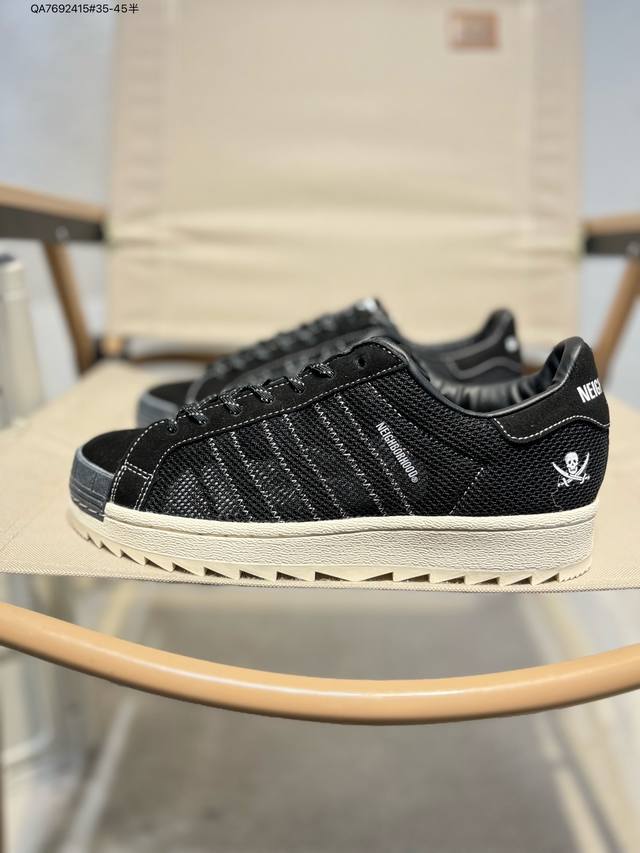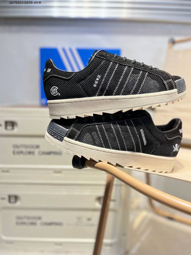 原楦原纸版开发版型#采用翻毛皮组合呼吸网织布鞋面材质#改良全包围鞋垫#正确版鞋底模具及扇贝头盖片#外置正确锯齿防滑耐磨加厚鞋底重磅三方联名,陈冠希主理品“凝结集团”与日本街头潮流文化著名品牌Nbhd Neighborhood X Clot X Adidas Originals Superstar pns Black 贝壳头锯齿底系列低帮百搭休闲运动板鞋“联名黑白海盗骷髅头”Ie8879 Qa7692415#35-45半
